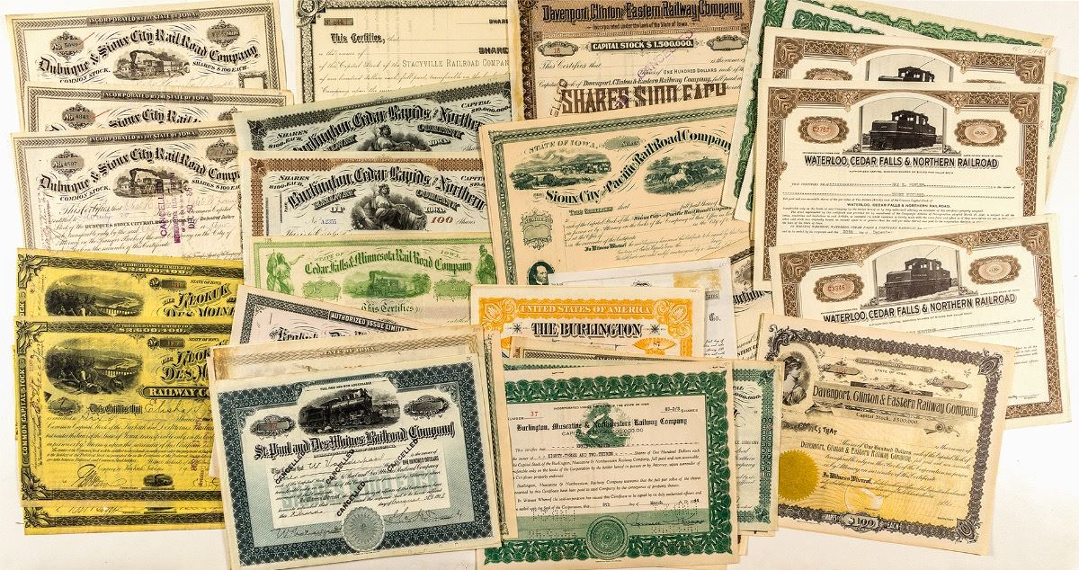 Lot of 44 certificates with many great train vignettes. Thirty-one are issued. Highlights include: 3 attractive certs. from The Keokuk & Des Moines Railway Company (1895, 1898, 1899) with logging and railroad vignette; Dubuque & Sioux City Railroad Co. (4) 1875-1880; St. Paul and Des Moines RR Co. (5) 1909-1918; Burlington and Missouri River (1870); $500 bond for Burlington Electric Railway (1891); and ten certs. for Waterloo, Cedar Falls & Northern. Thirteen others are unissued, including early certificates c. 1860s-70s. Please inspect. (Prag Collection) City: State: Iowa Date: hwac# 33952
