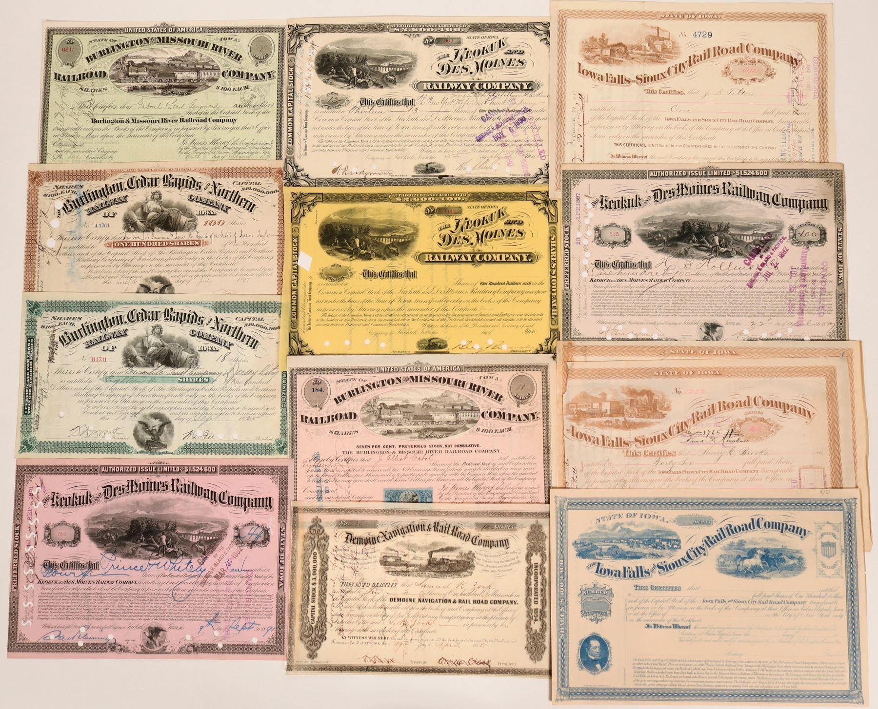 1. Lot of 8 different. Included: Keokuk & Des Moines Railway Company (1885, 1887, 1891, plus unissued);Burlington & Missouri River Railroad Company (1871 and 1872); and Burlington, Cedar Rapids & Northern Railway Company (1897, 1925). All pictorial. All punch cancelled. 2. Four certificates. Incorp. 1867 state of Iowa started operations in 1867 and stopped service in 1888 for a total period of operations of 21 years. 1. Three certificates I/C, $100 par , brown, vignettes of 4-4-0 l-r , no seal, Western Bank Note Co printer. #4729 issued Feb18, 1887. #1287 issued June 28, 1880 and #1282 issued June 24, 1880. VF