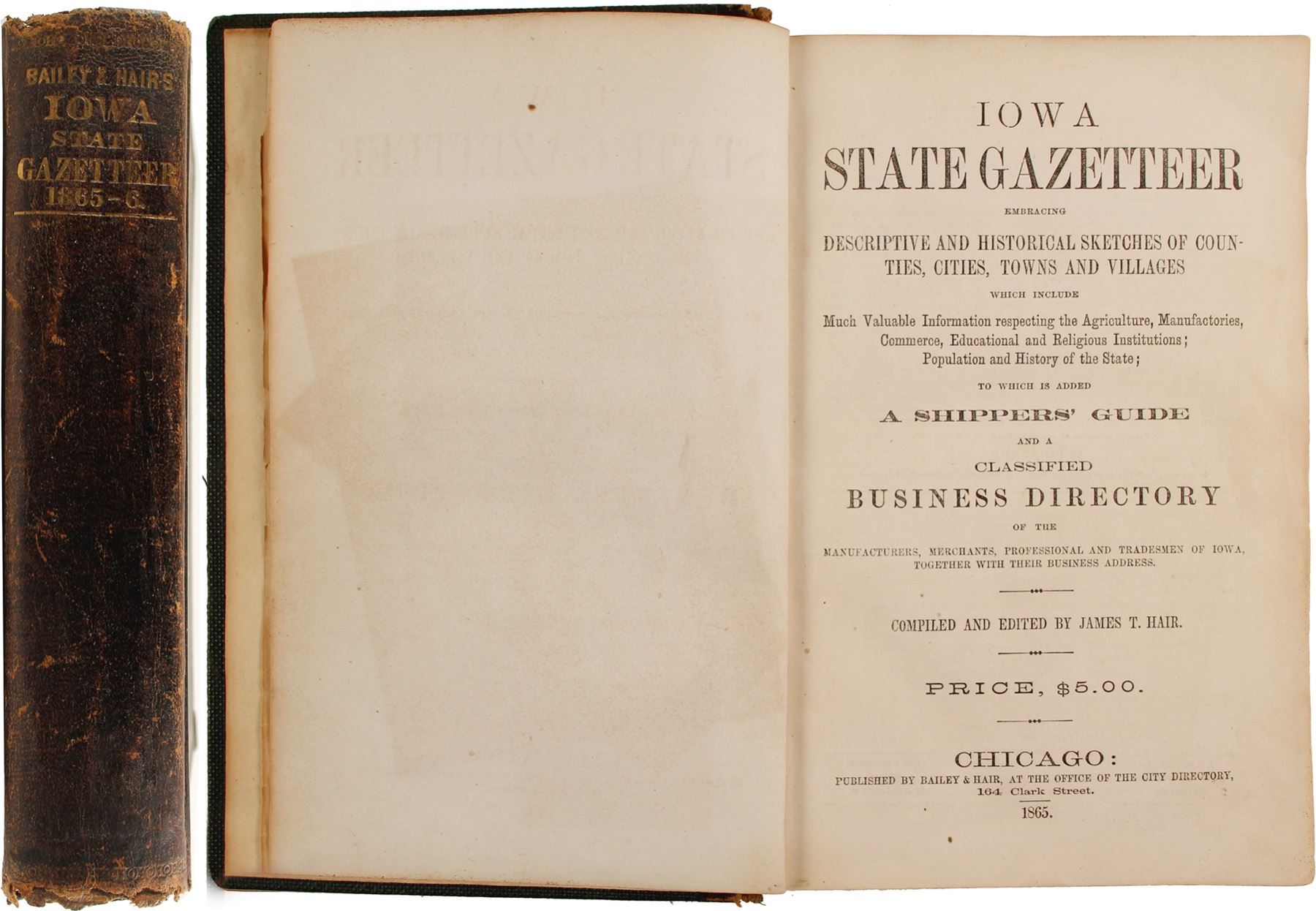 Hair, James T. Iowa State Gazetteer: Embracing Descriptive and Historical Sketches of Counties, Cities, Towns and Villages, Which Include Much Valuable Information Respecting the Agriculture, Manufactories, Commerce, Educational and Religious Institutions, Population and History of the State: to Which Is Added a Shippers' Guide and a Classified Business Directory of the Manufacturers, Merchants, Professional and Tradesmen of Iowa, Together with Their Business Address. Bailey & Hair, 1865._x000D_