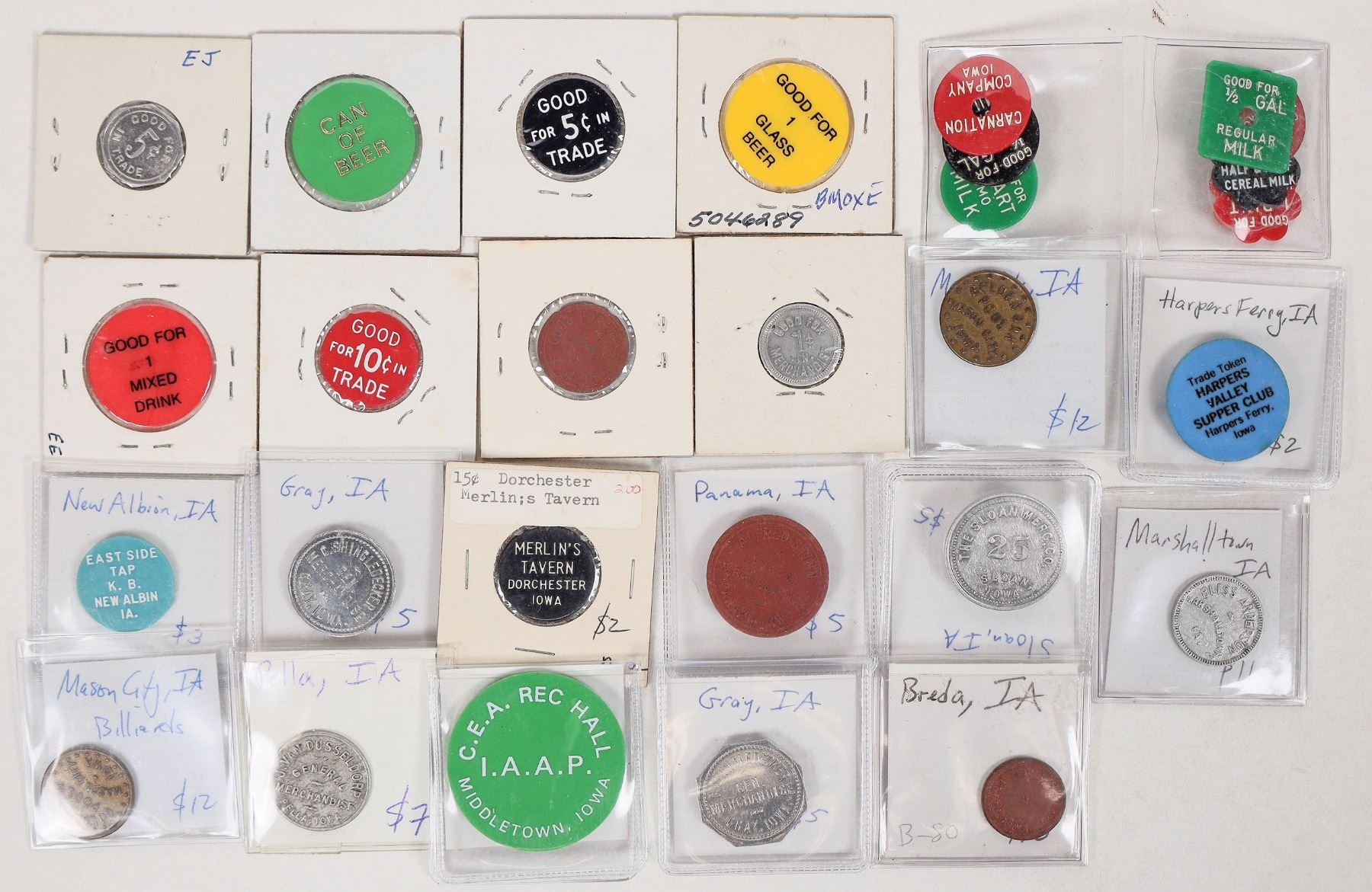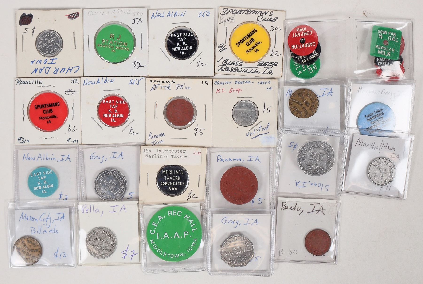 Group of 28 tokens from The Hawkeye State: Gray, Sloan, Harpers Ferry, Panama, Marshalltown, Pella, Breda, New Albin, Scotch Grove, Rossville, Middletown, Mason City, Churdan, Dorchester.
