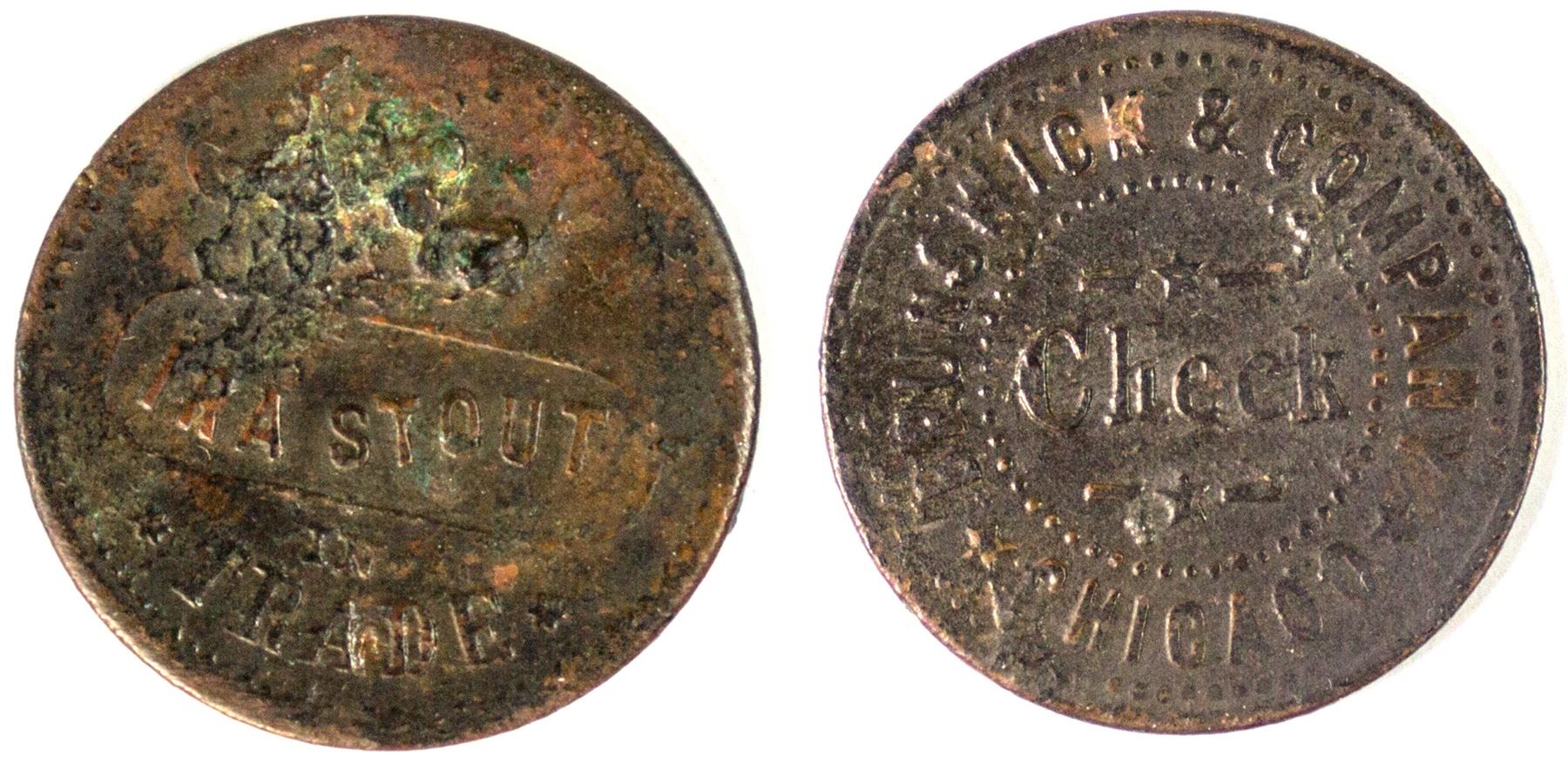 Ira Stout/ GF 5c IT// Brunswick & Co. (pic pool table). c1875-1880 token, listed in the Token Catalog, researched by Much or Greever, this is that piece. Date: Location: New Richmond, Indiana HWAC# 56010