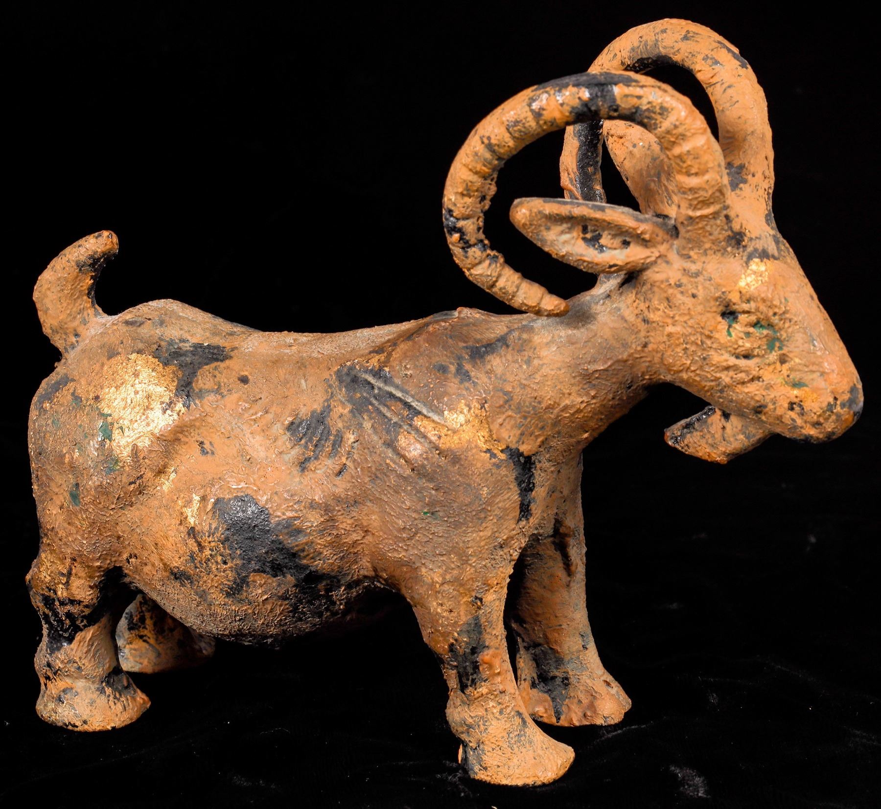 Antique Chinese cast iron buck goat sculpture. Appears to have been gold leafed at some point. 5"x 6"x 2". $150-300