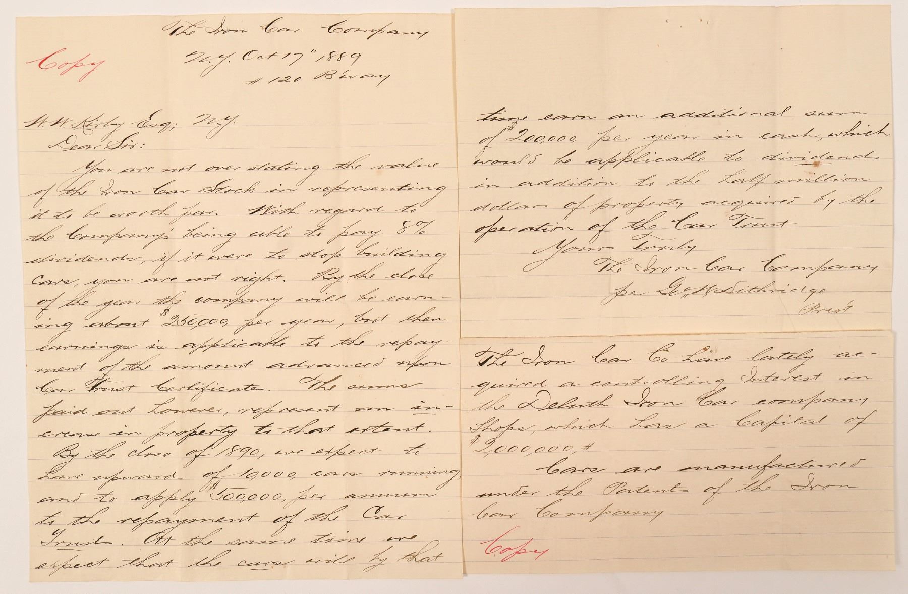 Interesting letter written for the president of the Iron Car Company WW kirby. "By the end of the year the company will be earning over $250,000 a year." Sent October 17, 1889. Seems to have been in business from 1893 to 1890. The railroad site www.midcontinent.org/rollingstock reports that there was an attempt to reorganize the company in 1890/91 but to no avail. Ken Prag Collection
