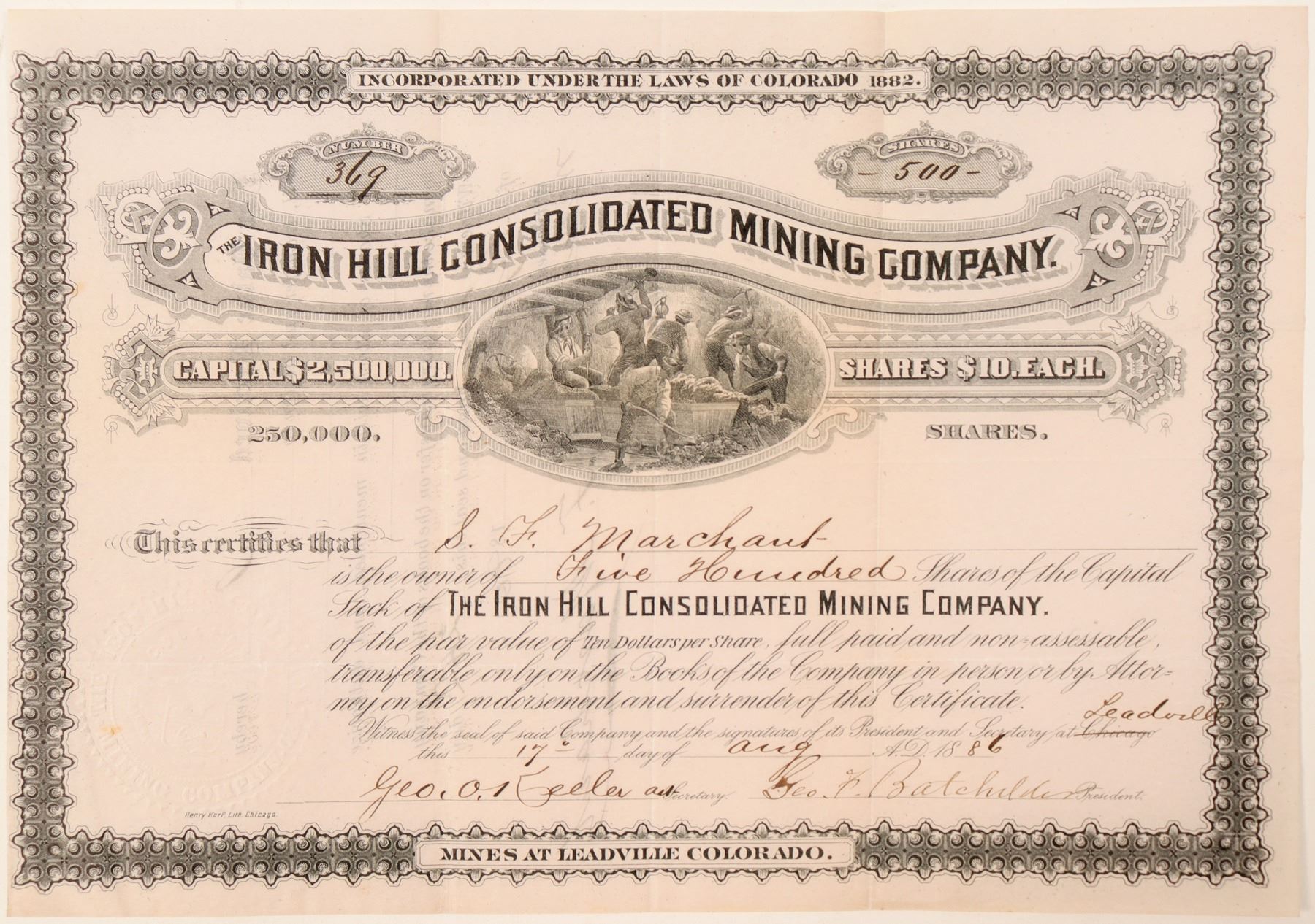Inc. in Colorado, 1882. Mines at Leadville, Colorado (printed at bottom). No. 369, issued for 500 shares to S.F. Marchant on Aug. 17th, 1886. Signed by president Geo. Batchilder and asst. secretary Geo. Keeler. Not cancelled. Printed on light pink paper by Henry Korf, Chicago. Ornate logo and vignette of seven miners working underground. Deep folds. 7 x 10" Formed by key Leadville mining figure John F. Campion, known as "Leadville Johnny," in 1879. The Leadville Daily Herald reports on Nov. 10th, 1883 that the company employs between 90-100 men. () Ken Prag Collection