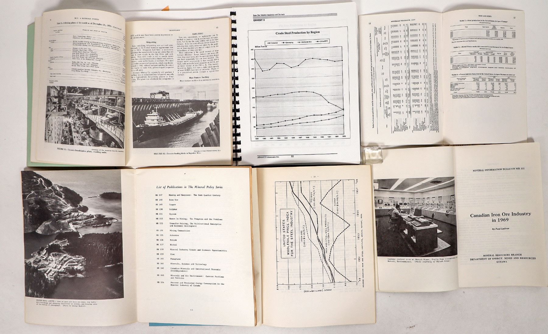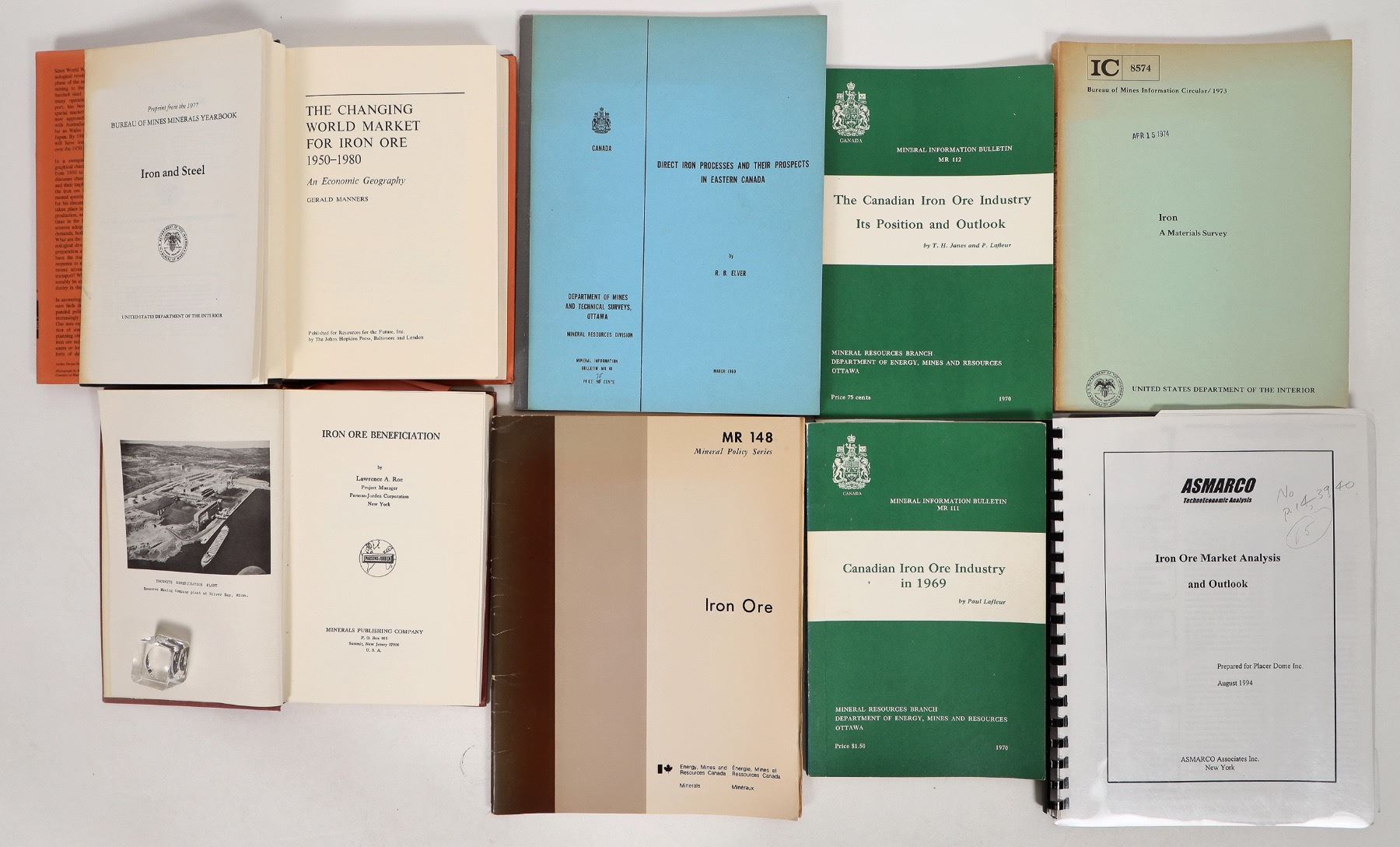Collection of 8 books on the subject of Iron Ore, from the U.S. and Canada, c1957-94. Includes: "Iron Ore Beneficiation," Lawrence A. Roe, 1957, hardback, 305 pp.; "The Changing World Market for Iron Ore 1950-1980," An Economic Geography, Gerald Manners, 1971, hardback, dust cover, 384 pp.; "Iron Ore Market Analysis and Outlook," Asmarco TechnoEconomic Analysis prepared for Placer Dome Inc., August 1994, folder, 99 pp; 2 booklets by U.S. Dept. of the Interior-Bureau of Mines - 1973 circular, "Iron-A Materials Survey," and 1977 preprint from Minerals Yearbook, "Iron and Steel"; and 4 Canadian booklet publications - "Iron Ore," Energy Mines and Resources Canada, 1976, 2 Mineral Information Bulletins, Mineral Resources Branch, Dept. of Energy, Mines and Resources, Ottawa, 1969 & 70, and "Direct Iron Process and their Prospects in Eastern Canada," Dept. of Mines and Technical Surveys, Ottawa, 1960.
