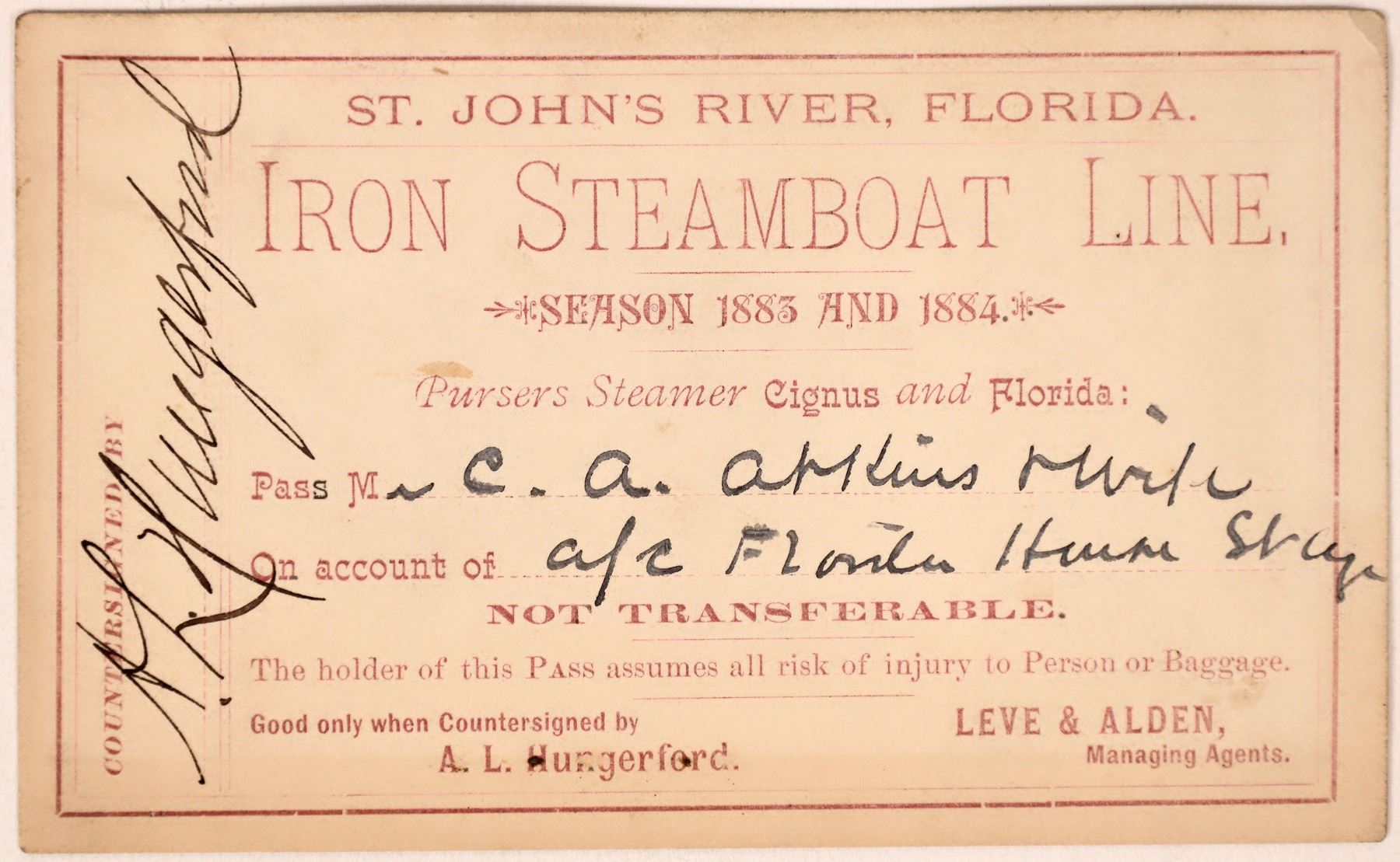 "St. John's River, Florida" printed at top. Rare pass for two years: "Season 1883 and 1884" printed under title. "Pursers Steamer Cignus and Florida." Issued to CA Arkins & wife. Countersigned by AL Hungerford. Red print. Adhesive and paper residue on reverse. 3 x 4.5" This appears to be the Florida branch of a steamship line mostly based out of New York City.