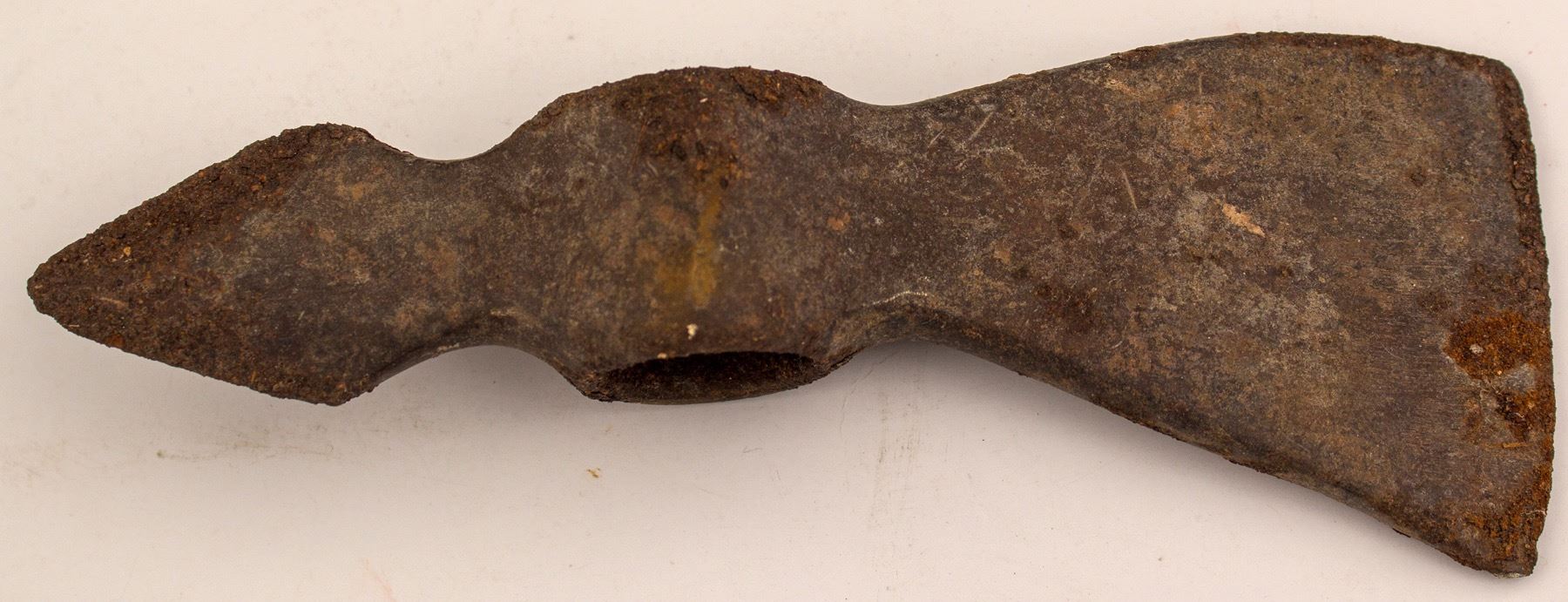 This is an iron tomahawk head that measures about 6"x 2". It's obviously from a dig, but shows no chips or cracks, only rust and wear. Great American Indian collectible. Date: Location: HWAC# 56662