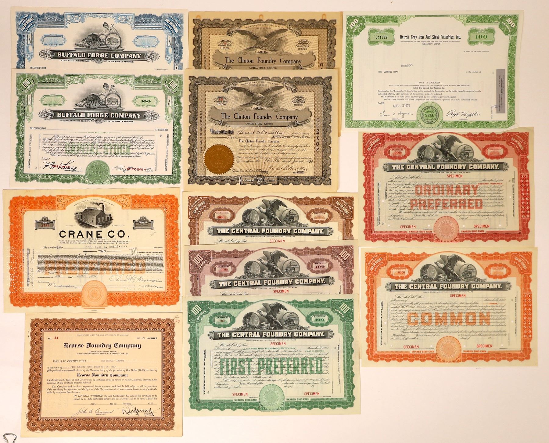 A dozen iron and steel foundry stock certificates from the U.S., issued from 1920-1972, includes seven specimens. Five specimens are from the Central Foundry Co., a Maine corporation which was organized in 1911. Central was a large manufacturer of cast-iron soil pipe and fittings. Identical 12" x 8" certificates feature eagle, foundry employees and plant vignettes, and are various different colors, all dated 19__ and in pristine condition. Two specimens from Buffalo Forge Company, Greek-inspired woman with buffalo vignettes, signed by President and Secretary, 12" x 8", pristine condition. Others included are: two The Clinton Foundry Company, inc. in N.J., eagle and U.S. flag vignettes, gold embossed seals, both issued in 1920 and signed by President and Secretary, uncanceled, 10.25" x 8.25", pristine condition; Crane Co., 12" x 8.5", company plant vignette, issued in 1929, signed by V.P., Secretary and Treasurer, excellent condition with light folds; Detroit Gray Iron and Steel Foundries, Inc., Michigan, no vignette, signed by President and Secretary, issued in 1972, 12" x 8", pristine with one fold on lower right corner; and Ecorse Foundry Company, inc. in Michigan, no vignette, 11" x 8.25", embossed seal, issued in 1936, signed by President and Secretary, pristine condition with two light folds.