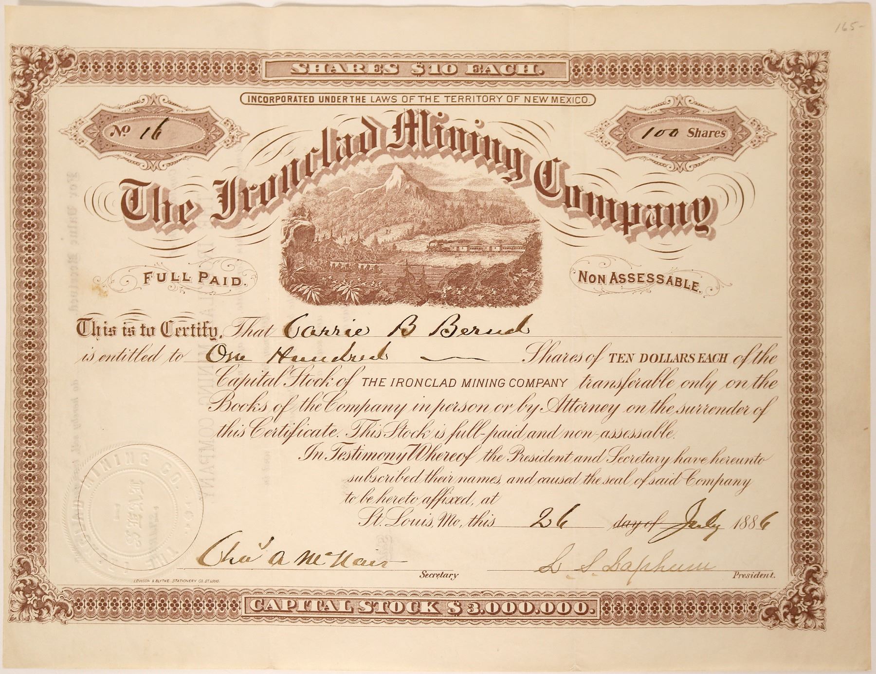 # 16 for 100 shares to Carrie B Beruch. Signed by Charles A McNair and president SS Saphum. Dateline St. Louis 1886. Incorporated June 1885. Not cancelled. peaceful valley vignette with steam train running through the middle. Levinson & Blythe printers. Nicks at fold edges. Heavy folds. Otherwise no apparent issues. "At the rate work has been going on for several months the ironclad tunnel will be completed about July 1st. It will cost about $18,000 and is purely a venture out of which the owners will get nothing if mineral is not found, but on the other hand if the tunnel strikes the mineral vein the question as to the profit of deep mining at Kingston will be set at rest. The end of the tunnel will be about 700 feet below the surface so that the expense of hoisting will be saved on all ore taken out above the tunnel level." [Engineering and Mining Journal, February 15, 1890] Since we found no other information on this mine, we assume it is the former! Ken Prag Collection