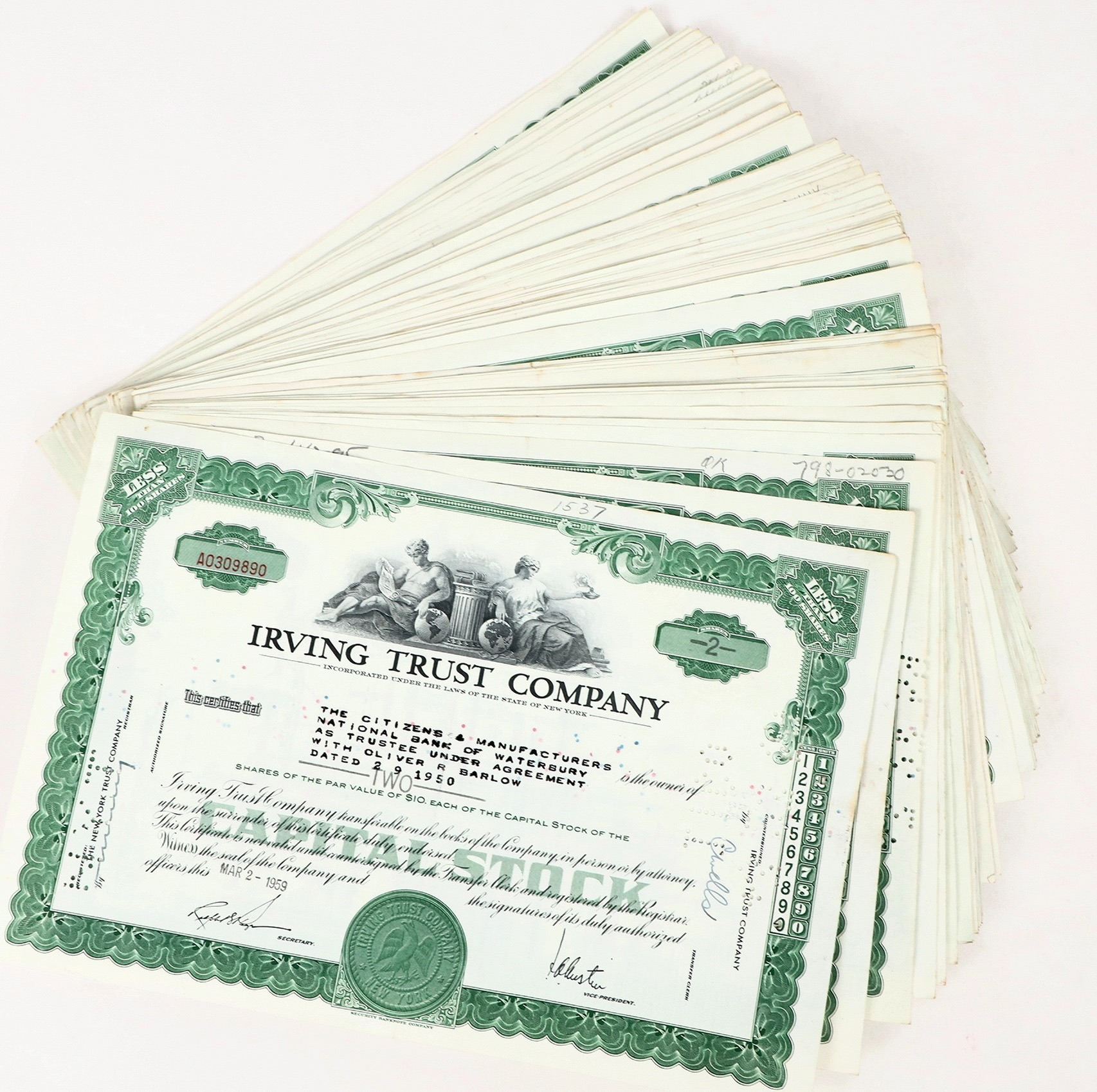Group of approx. 130 stock certificates from the Irving Trust Company of New York City, issued 1958 and 1959. All issued and cancelled. Nice allegorical vignette. 12"x8" certs, generally in good condition; see photo for details.