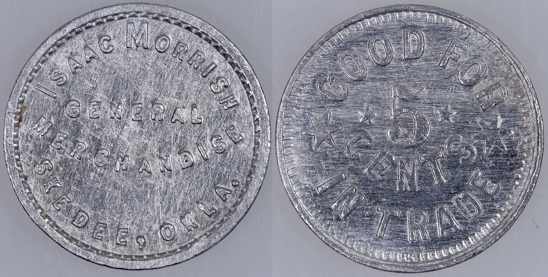 From the Pawnee County town of Skedee: ISAAC MORRISH / GENERAL / MERCHANDISE / SKEDEE, OKLA. // GOOD FOR / 5 / CENTS / IN TRADE; Al., rd., 20 mm.