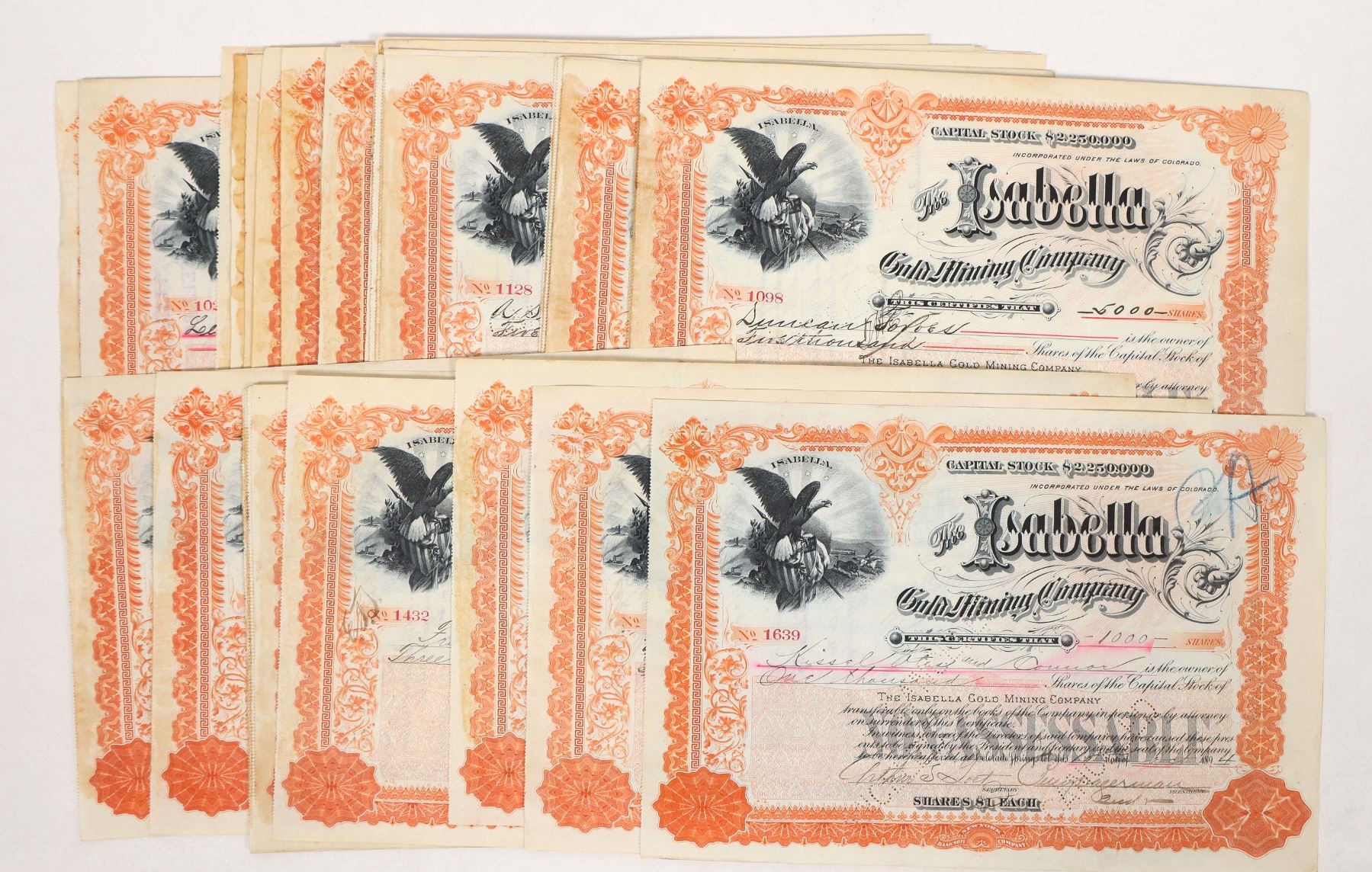 About 40 very early, 1893-95 Isabella Gold Mining stocks, many with Percy Hagerman signatures.