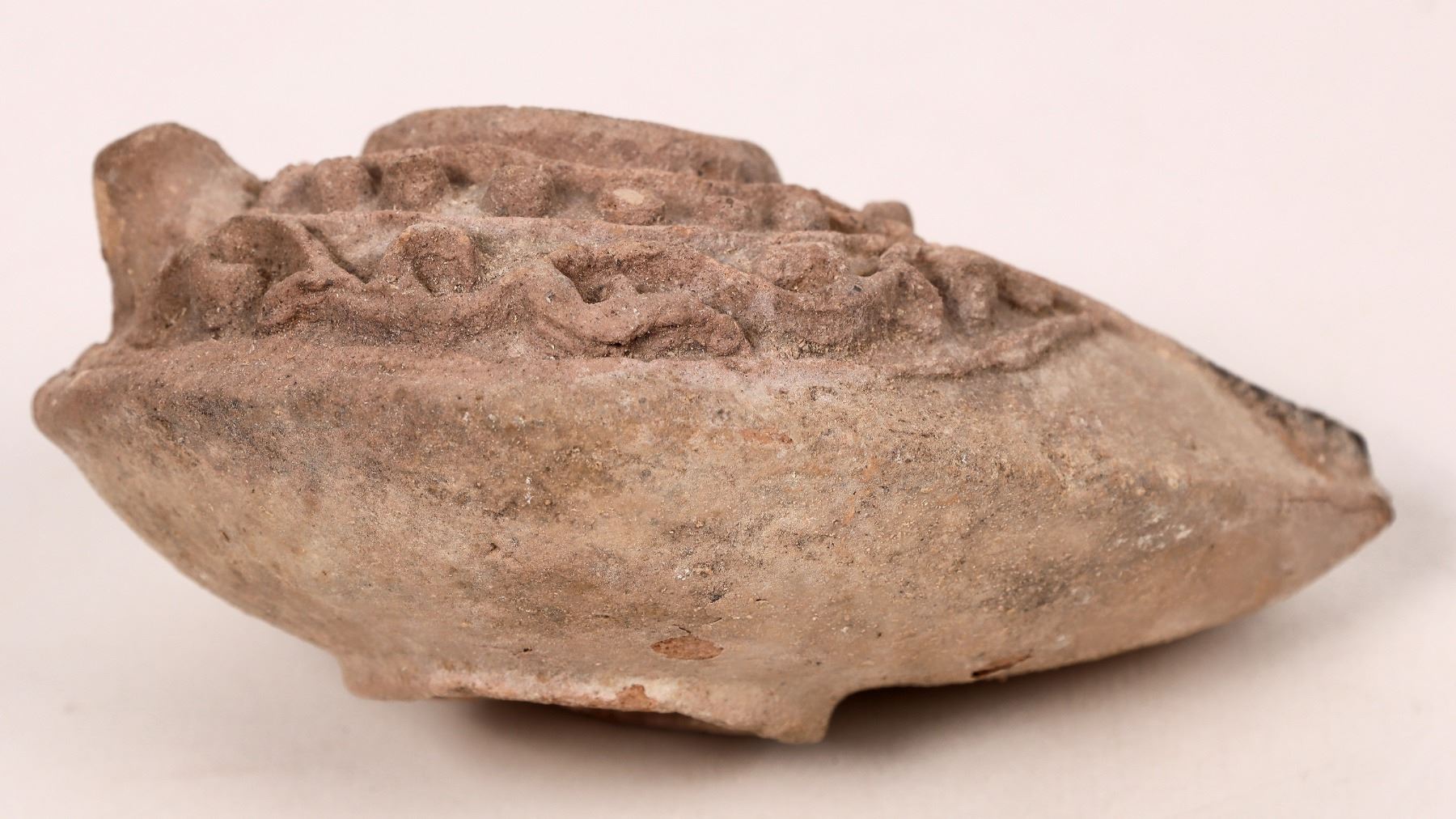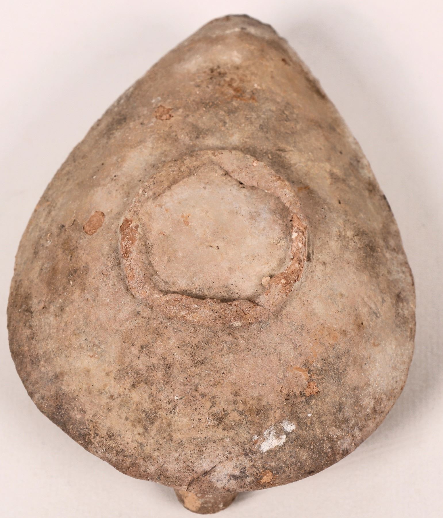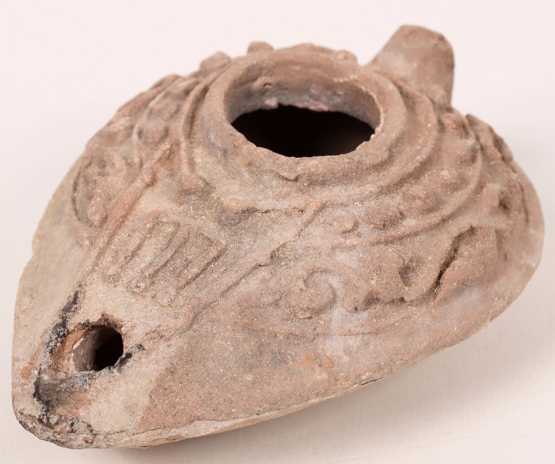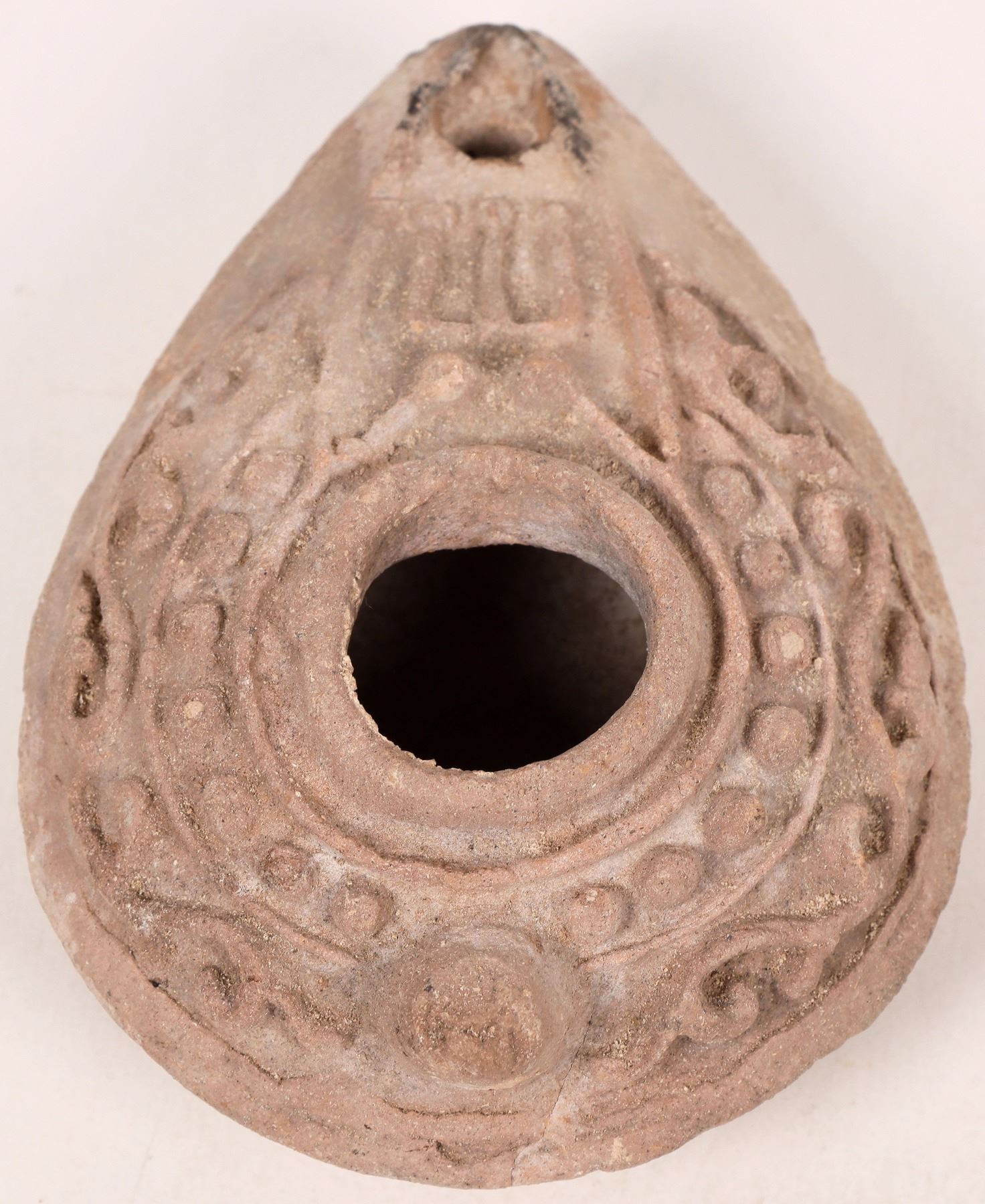 Islamic terra cotta pear-shaped oil lamp, 6-8 centuries AD. Trident between wick and fill holes, fill hole surrounded by dots and wreath motif. Tip of handle has been chipped as is quite common, otherwise intact. About four inches long. With authenticity receipt from Amphora Coins of Nyack, New York.
