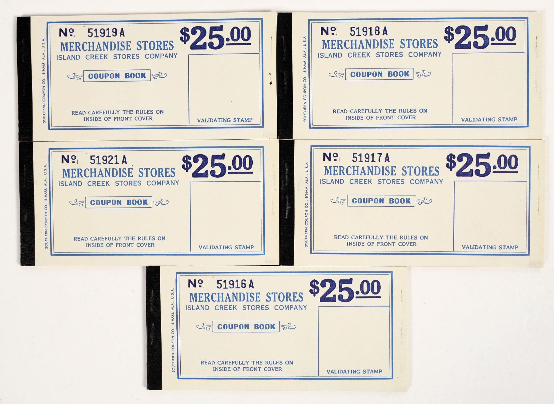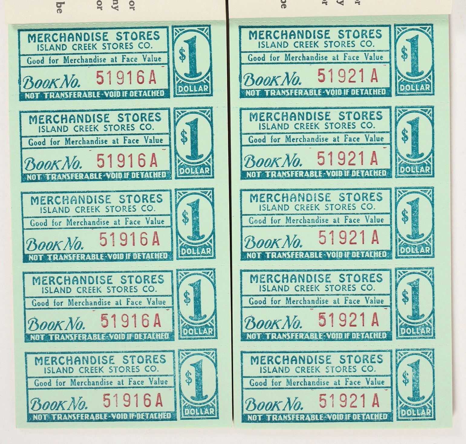 Five $25 coupon books from the Island Creek Stores Company of Holden, West Virginia. Published by Southern Coupon of Birmingham, Alabama. Pages in denominations from 1 cent through $1. Each book is 5 1/2 x 2 1/2 inches. Used by coal miners at the company store. Island Creek once owned 47 stores in three states.