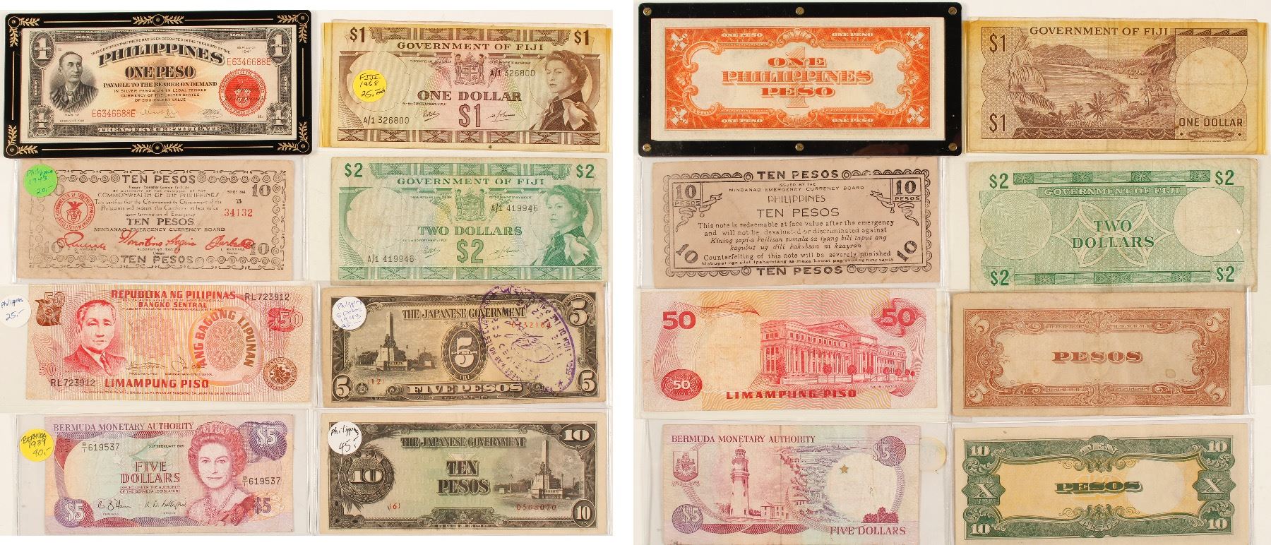 Lot of 9. Fun and smart looking paper bills from Bermuda, Fiji, Philippines, Japan. 1-10 pesos and 1-5 dollars. Colorful. Date: 1900 City: State: foreign HWAC# 76175