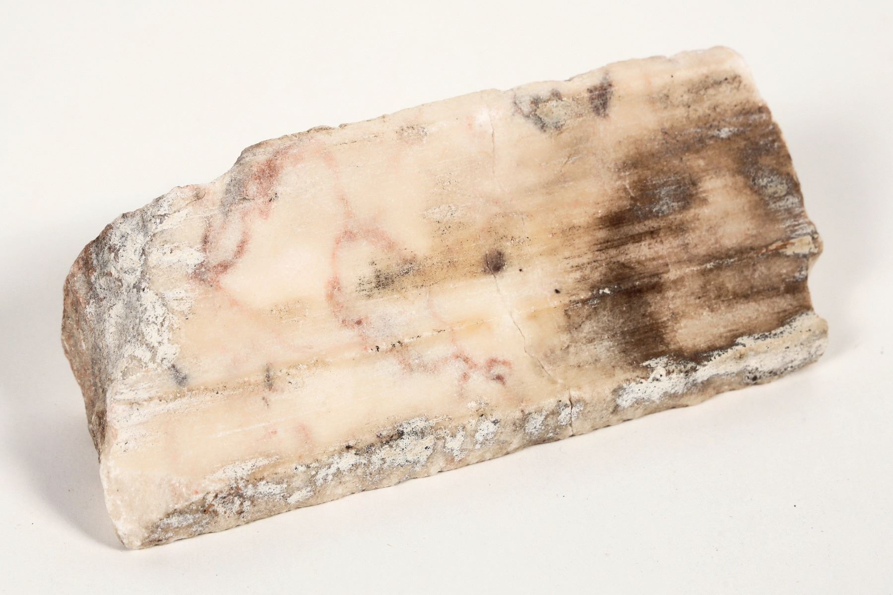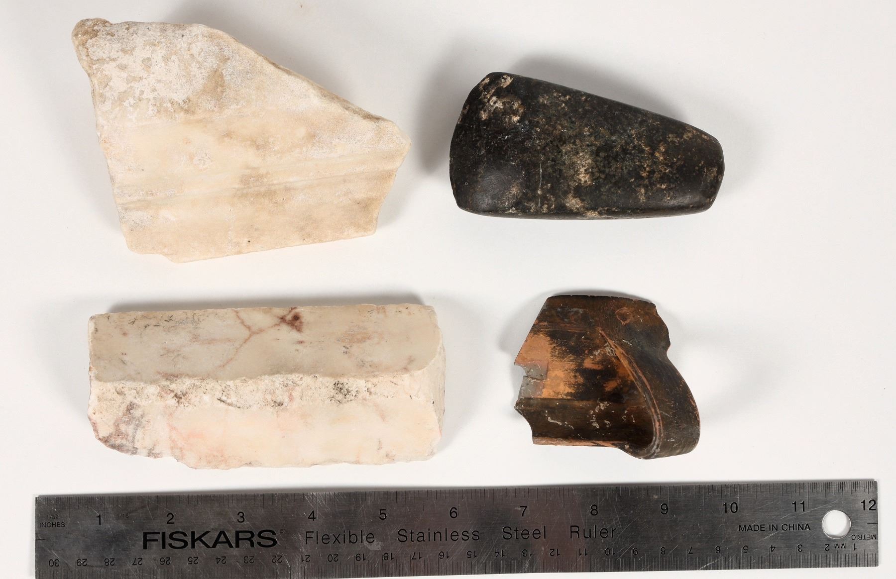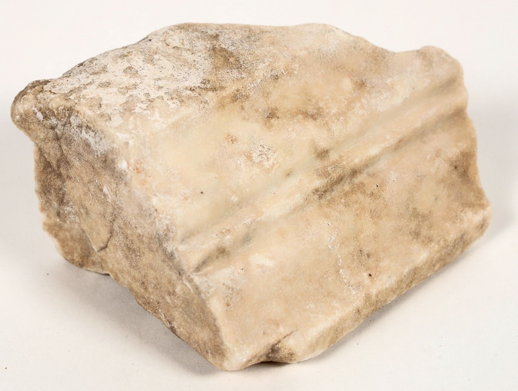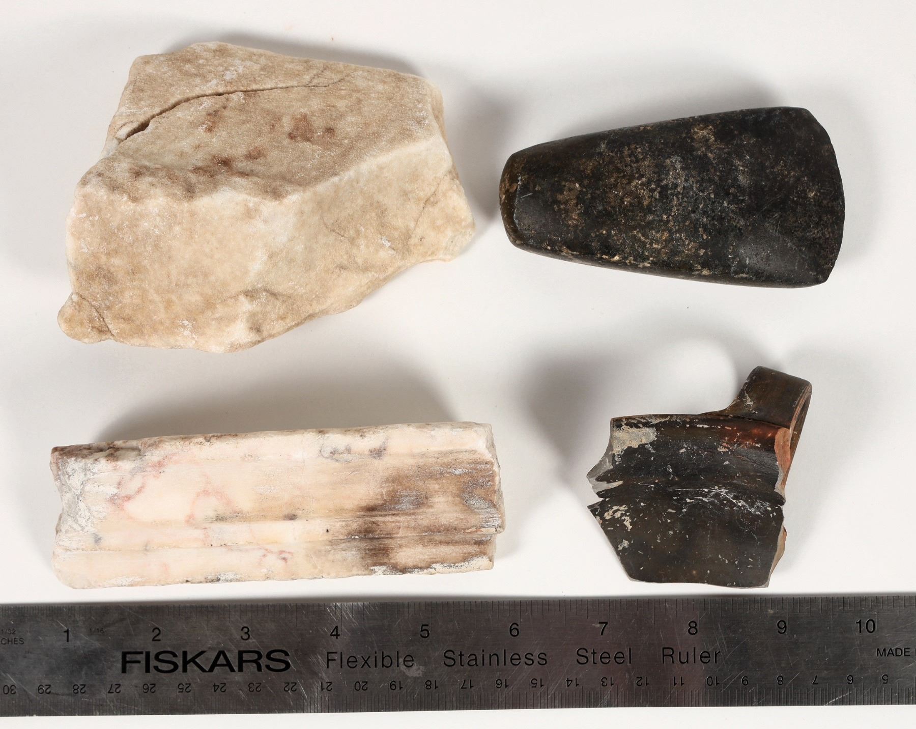 From the estate of Rudolph Herzog, group of stone artifacts from the island of Kos, ancient Greece. Two pieces of fluted carved alabaster (columns?), a small piece of what appears to be pottery with what looks like a spout, and a dark stone scraper or carving tool. These were collected before current laws were enacted for collection of such materials. Please see photos.