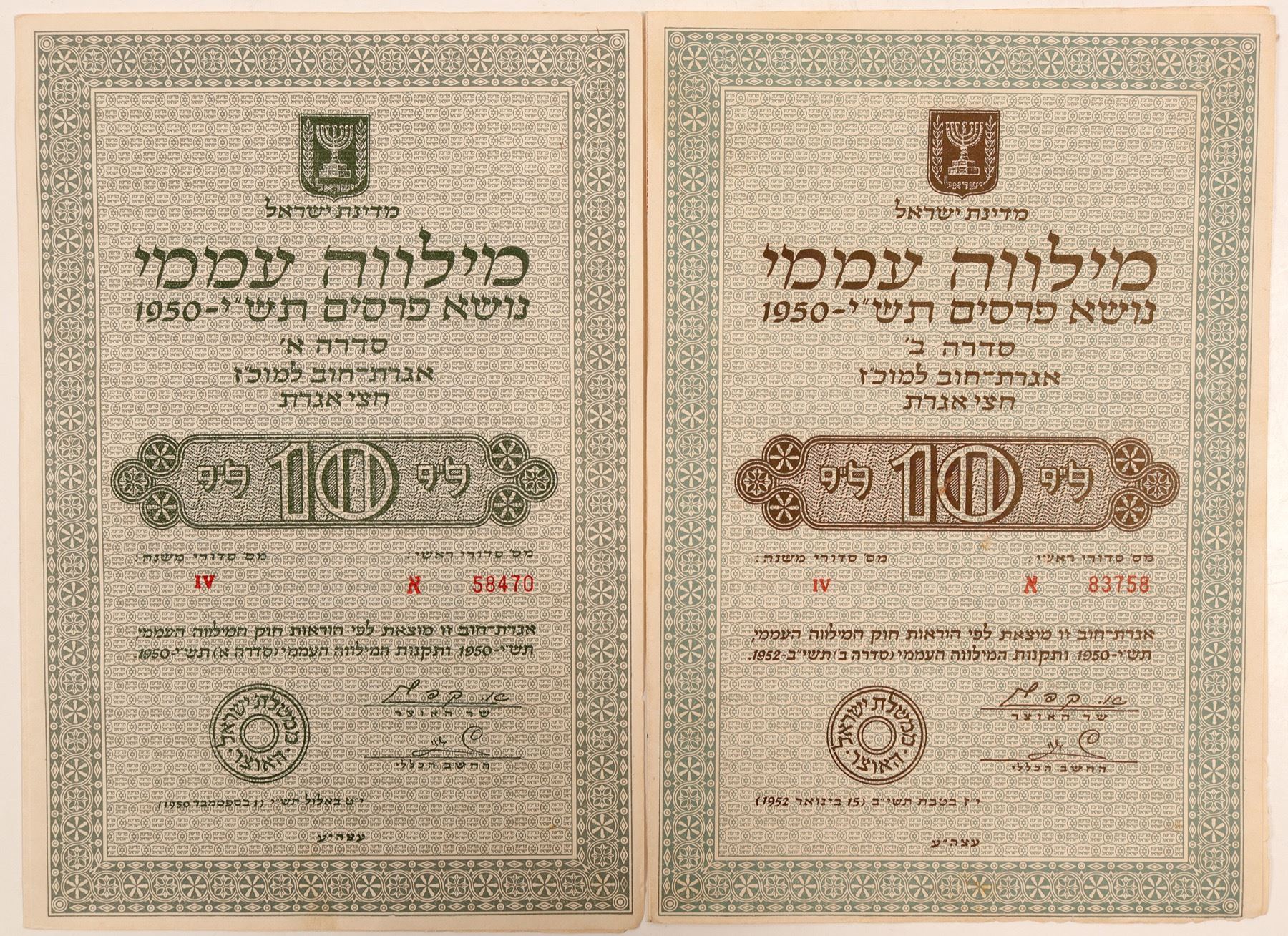 Item # 1 of 2: Very unusual Israeli bond, may have been used for travel purposes. Printed with a nice sage green border. Stock number # 58470. 10 Shares shown. 9 3/8 " high x 6 3/8' long. Also a great vignette on the top, of a Menorah. The Menorah is a symbol of the 7 days of creation, and is used during the 8 day festival of Hanukkah. This festival commemorates the re-dedication of the Second Temple in 164 B.C. under Judas Maccabaeus. Item #2 of 2: Same as as Item #1, but the stock number is # 83758 ( RH). Houghton Estate Collection