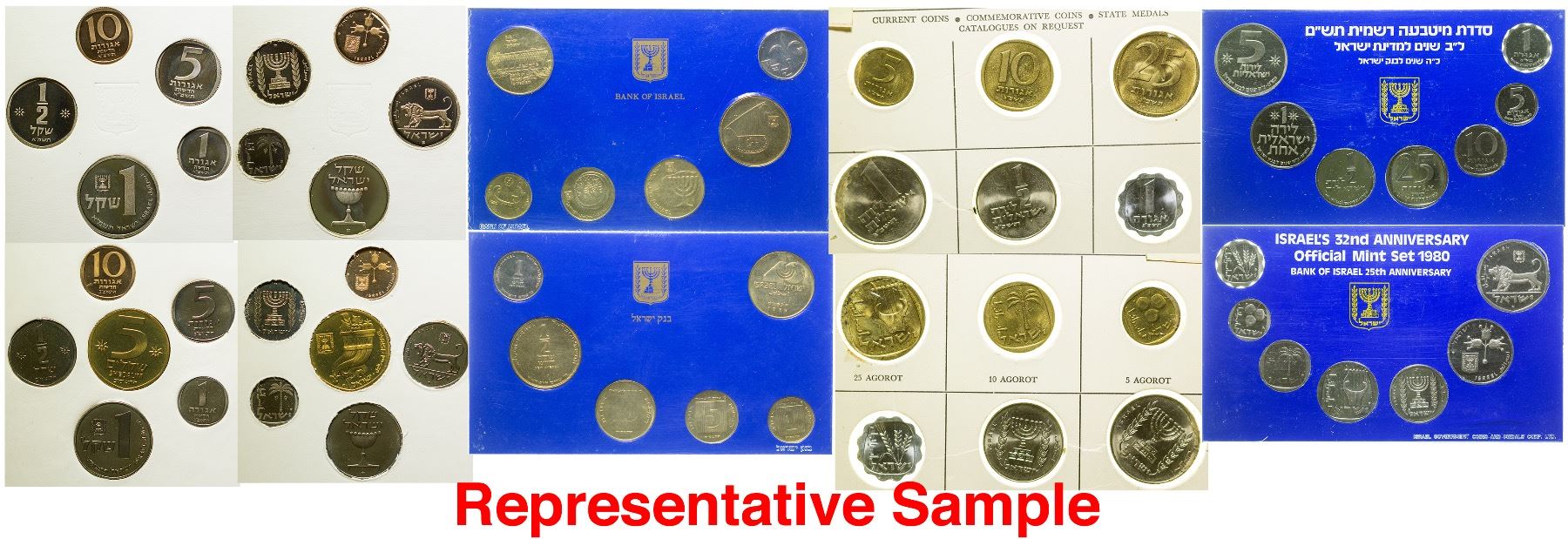 Lot of fourteen sets of Israeli coins. Bank of Israel. Three sets of 1963. Two sets of 1970. One 1980. Two 1981. One 1982. One 1983, 1984, 1987. One 1994 Golda Meir numismatic cover with a 10 New Sheqalim with portrait of Golda Meir (coin and bank note). State: City: HWAC#: 48905 Date: