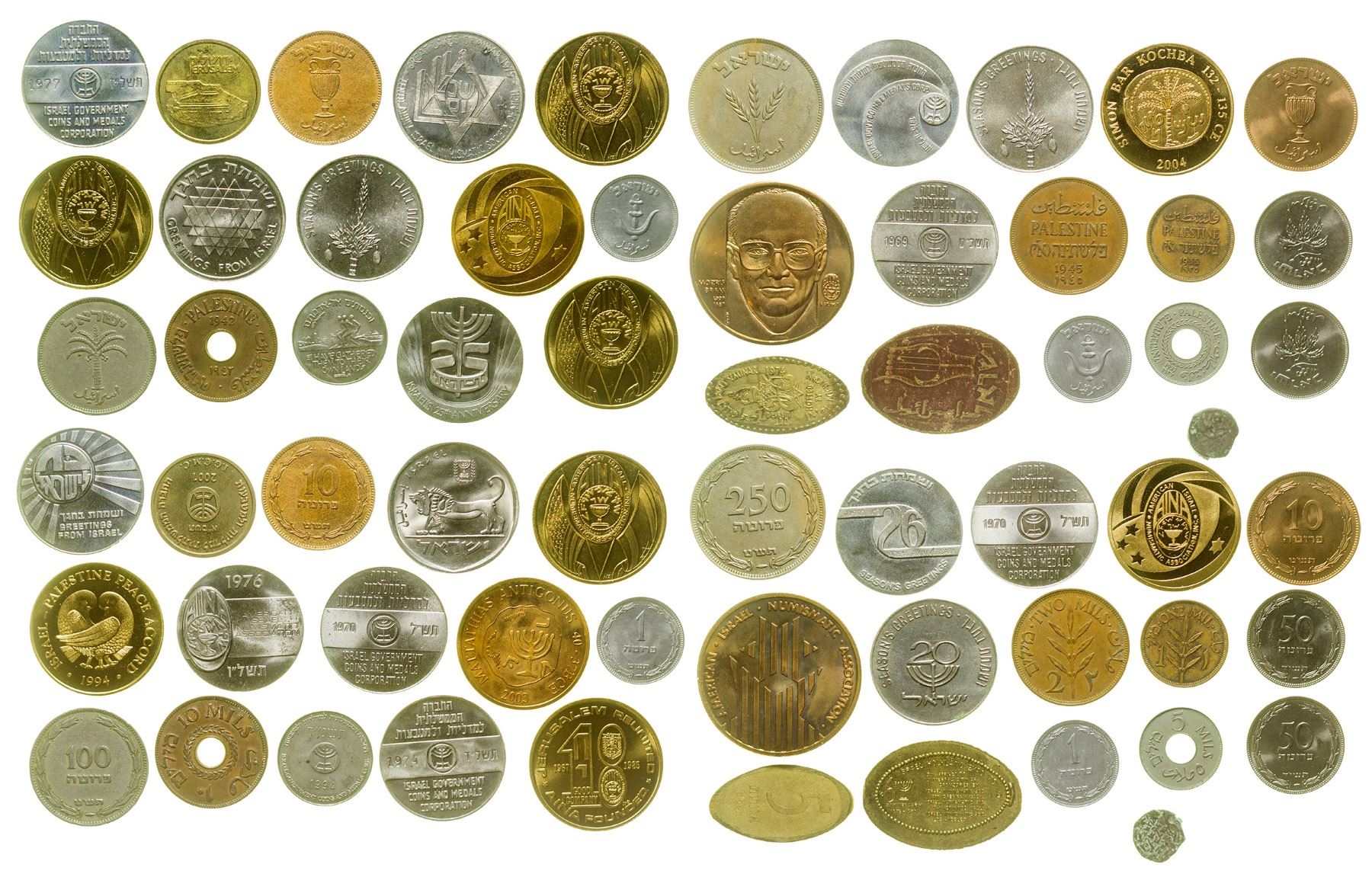 Lot of thirty copper, bronze, white metal small denomination coins. 1927 5 mils of Palestine (K-4), 1949 1PR. Interesting diversity in this lot. Also medals from Israeli Numismatic Society of Michigan and others. State: City: HWAC#: 48913 Date: