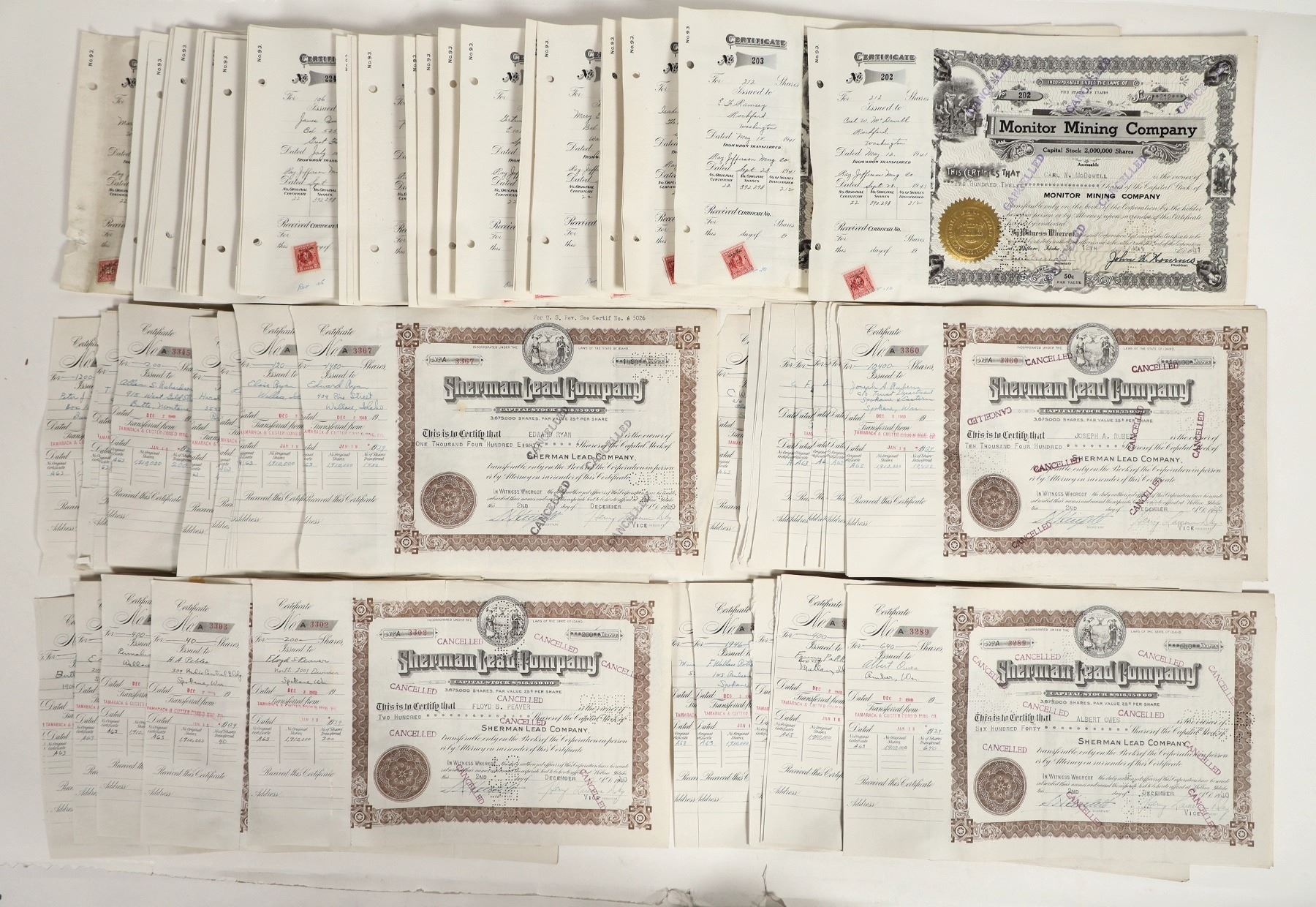 ~100 Monitor MC & ~150 Sherman Lead Co stock certificates, issued and later canceled. In good condition. See photo.