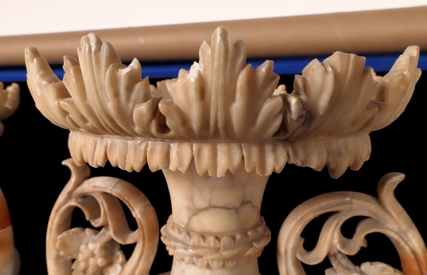 Two very ornate Italian marble vases. Each measures 2'x 11" with a 6"x 6" base. Tthere are repairs, so these pieces are being sold as is. They do look nice and repairs are barely visible. PLEASE INSPECT. Italy