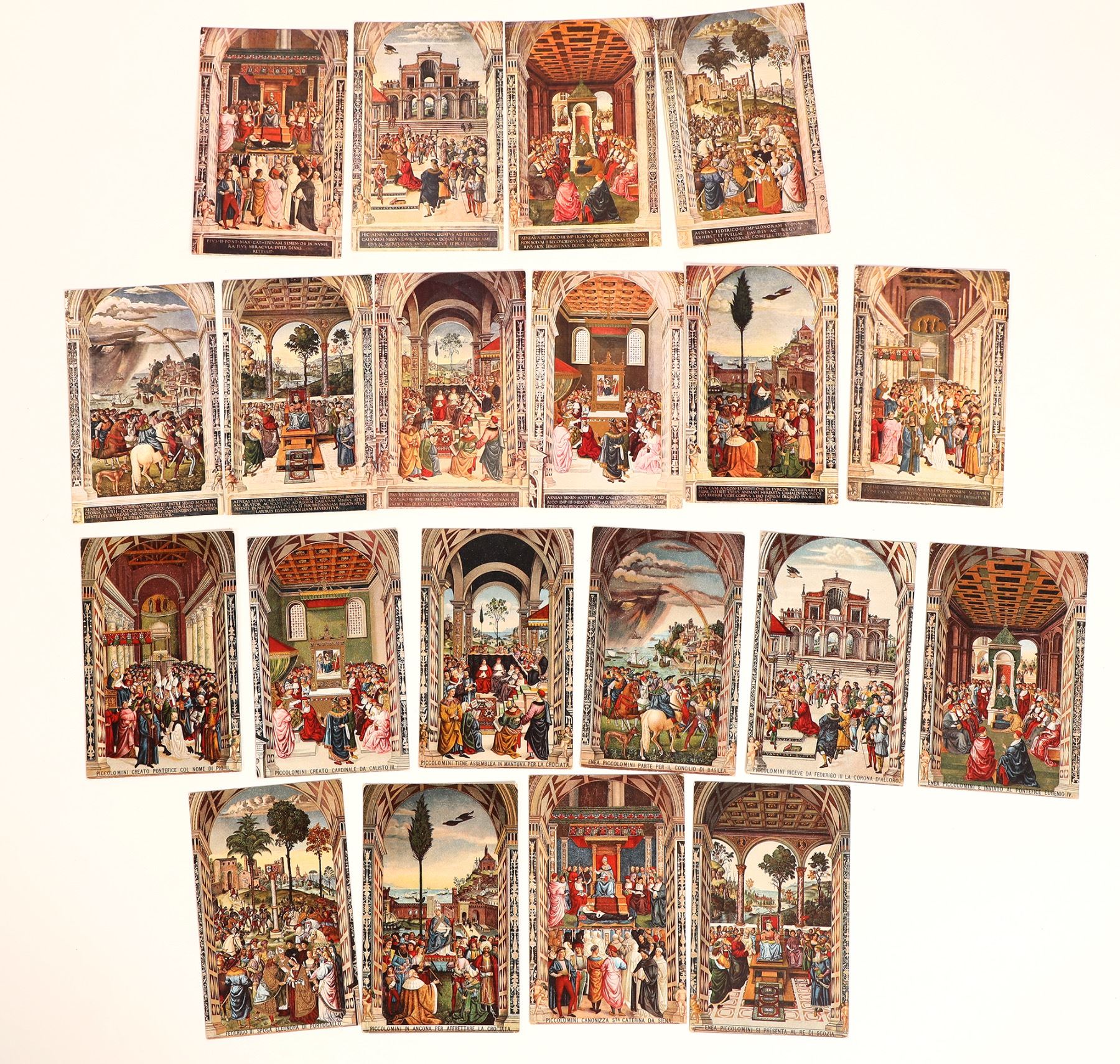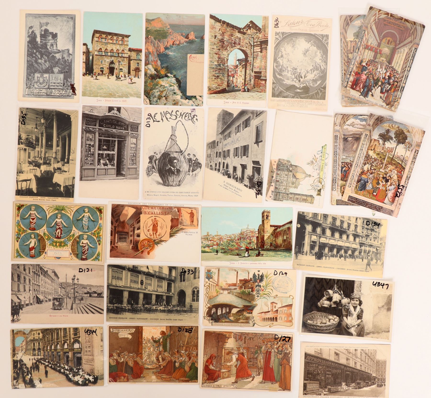 Several colorful postcards (30) of and from Italy. Included are several restaurants, shops, the Italian countryside, works of art and some of its people. Most are blank and unused. Some are used and postmarked. Several are pre-war. Please see photos for more details. [Italy]