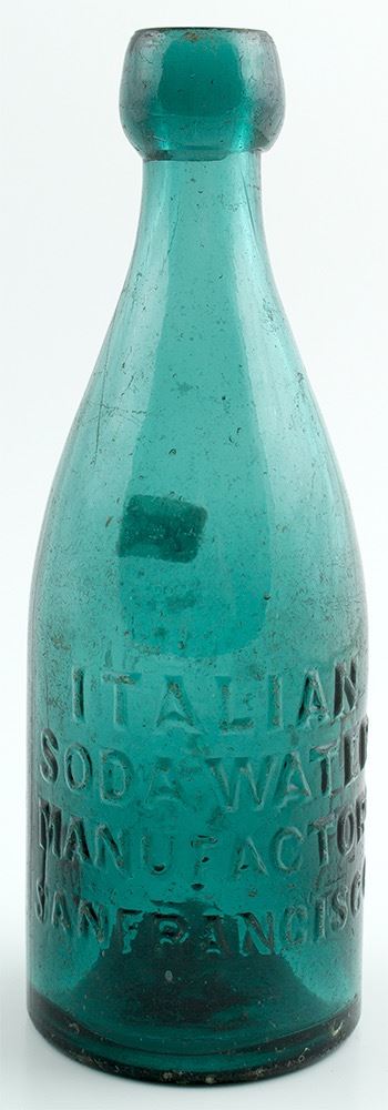 Italian Soda Water Manufactory, San Francisco. Union Glassworks Philadelphia. Graphite Pontil. Applied top. Some base wear and a surface bruise underneath Philadelphia that could be removed with professional polishing. This is a choice teal example. Italian Soda Works was in business in San Francisco from 1856-1863. Examples are known in green and cobalt. City: San Francisco State: California, Date: Inventory# 40913