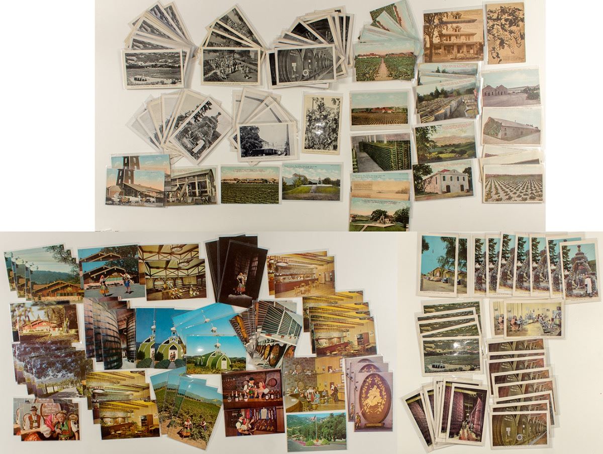 Lot of 184. Huge group with many types of postcards (early, B+W, colorized, chrome) for the Italian Swiss Colony. 1) Twenty-eight early cards depicting many scenes: Cream of Tartar Vats, Concrete Vaults, View of the Asti Vineyard, Wine Cellars, Storage Tank, Officers' Residence, etc. Printers included: Britton & Rey, Mitchell, Pacific Novelty Co. Seven have been mailed. Some duplicates. 2) Fifty-seven Black & White (White Border) (c. 1938-1950), most postally unused. Duplicates 3) Thirty-four colorized (c.1945-1955). Duplicates 4) Sixty chrome (c. 1957-1979). Duplicates. 5) Five So. California (Guasti) colorized cards: triplicate of vineyard view; two different views of the company plant. Please see photos for more details about this large lot. Fantastic collection for this important part of California wine history! City: State: California Date: hwac# 19041