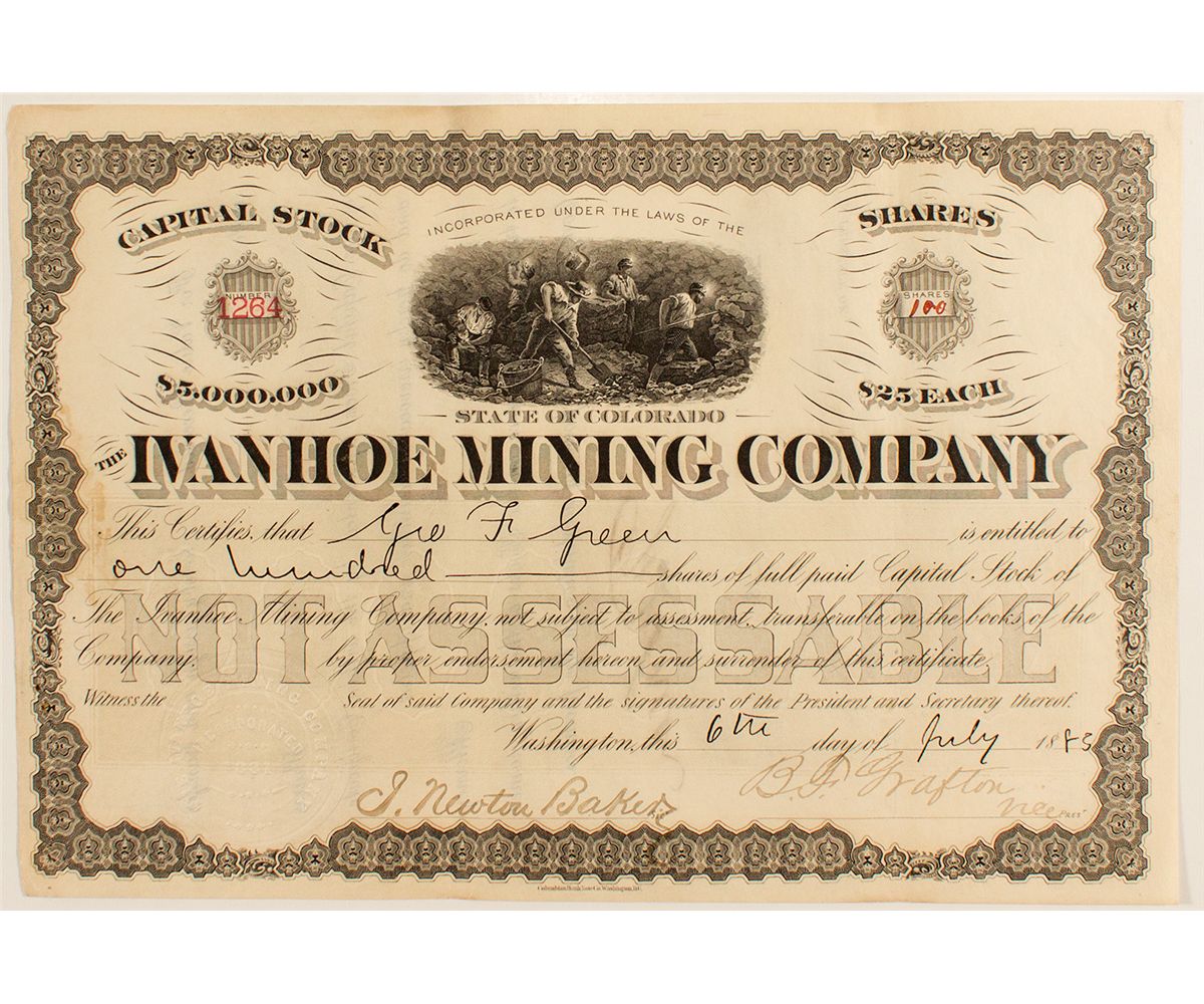 Inc. in Colorado. No. 1264. Uncancelled. Issued for 100 shares to Geo. F. Green on July 6th, 1883 in Washington. Signed by B.F. Grafton (vice president) and J. Newton Baker (secretary). Columbian Bank Note Co., Washington. Reverse is endorsed by Green. The mine was located in Gilpin County and contained gold, silver, and lead [ref: Report to the Senate 56th Congress 2nd session]. Measures 10 1/2" x 7/14" Some soiling.City: County: GilpinState: CODate: 1883