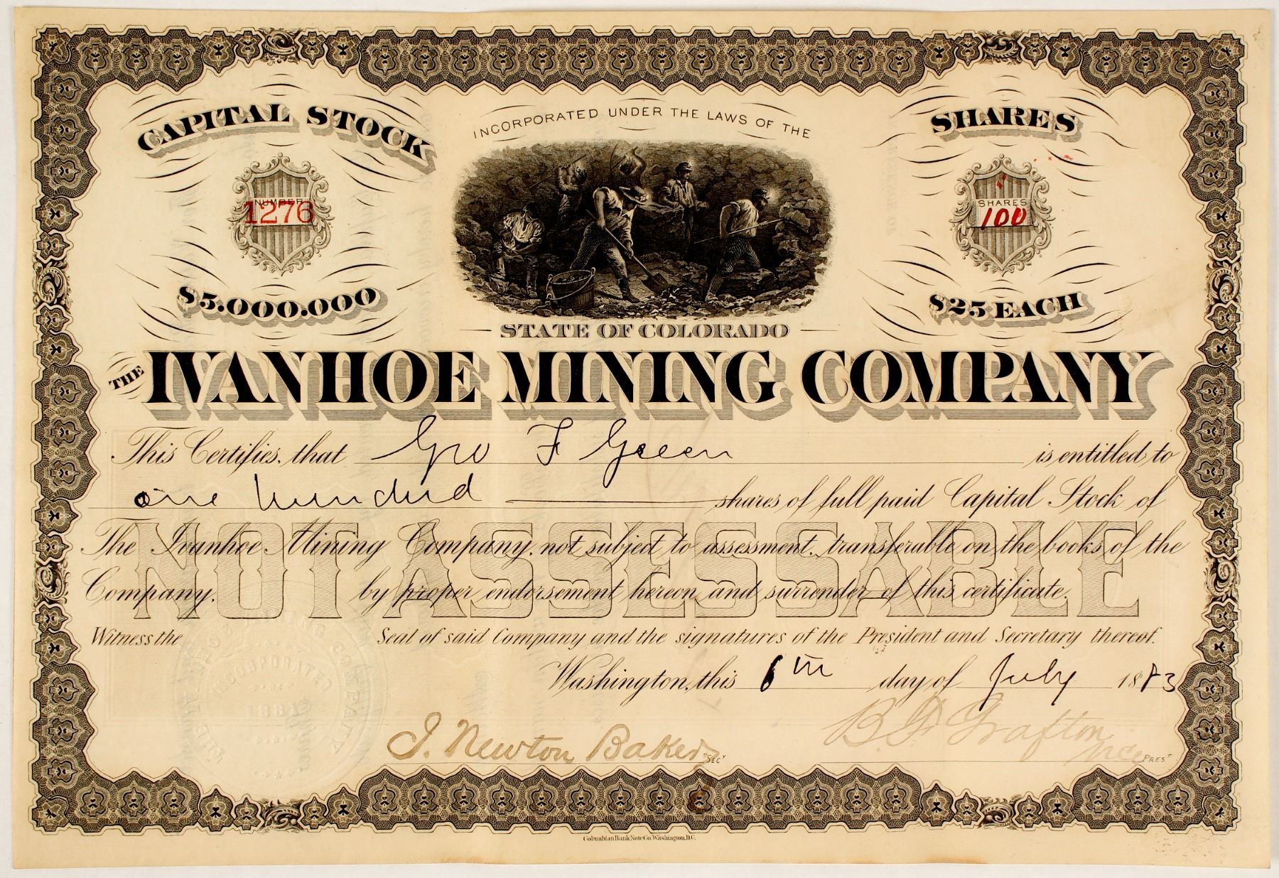 Mine not located. Many Ivanhoe mines in Colorado. Given the date, possibly Gilpin. Inc. in Colorado. No. 1276, issued for 10 0shares to Geo. F. Green on July 8th, 1883 in Washington. Signed by B.F, Grafton, vice-president, and J. Newton Baker, secretary. Not cancelled. Underground mining vignette. Printed by Columbian Bank Note. Folds, very fine. 7.25 x 10.5"  City:   State: Colorado  Date: