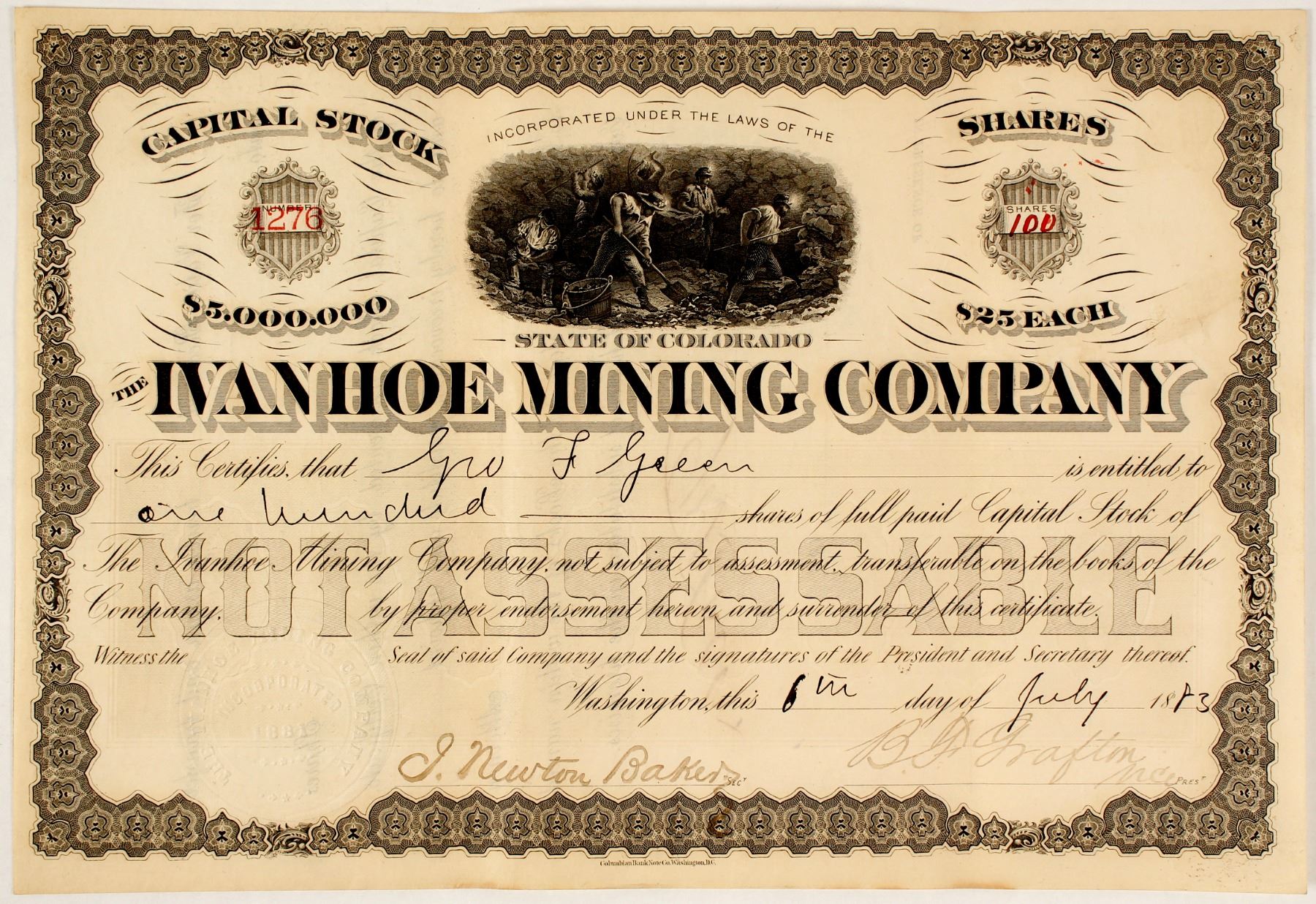 Mine not located. Many Ivanhoe mines in Colorado. Given the date, possibly Gilpin. Inc. in Colorado. No. 1276, issued for 10 0shares to Geo. F. Green on July 8th, 1883 in Washington. Signed by B.F, Grafton, vice-president, and J. Newton Baker, secretary. Not cancelled. Underground mining vignette. Printed by Columbian Bank Note. Folds, very fine. 7.25 x 10.5"
