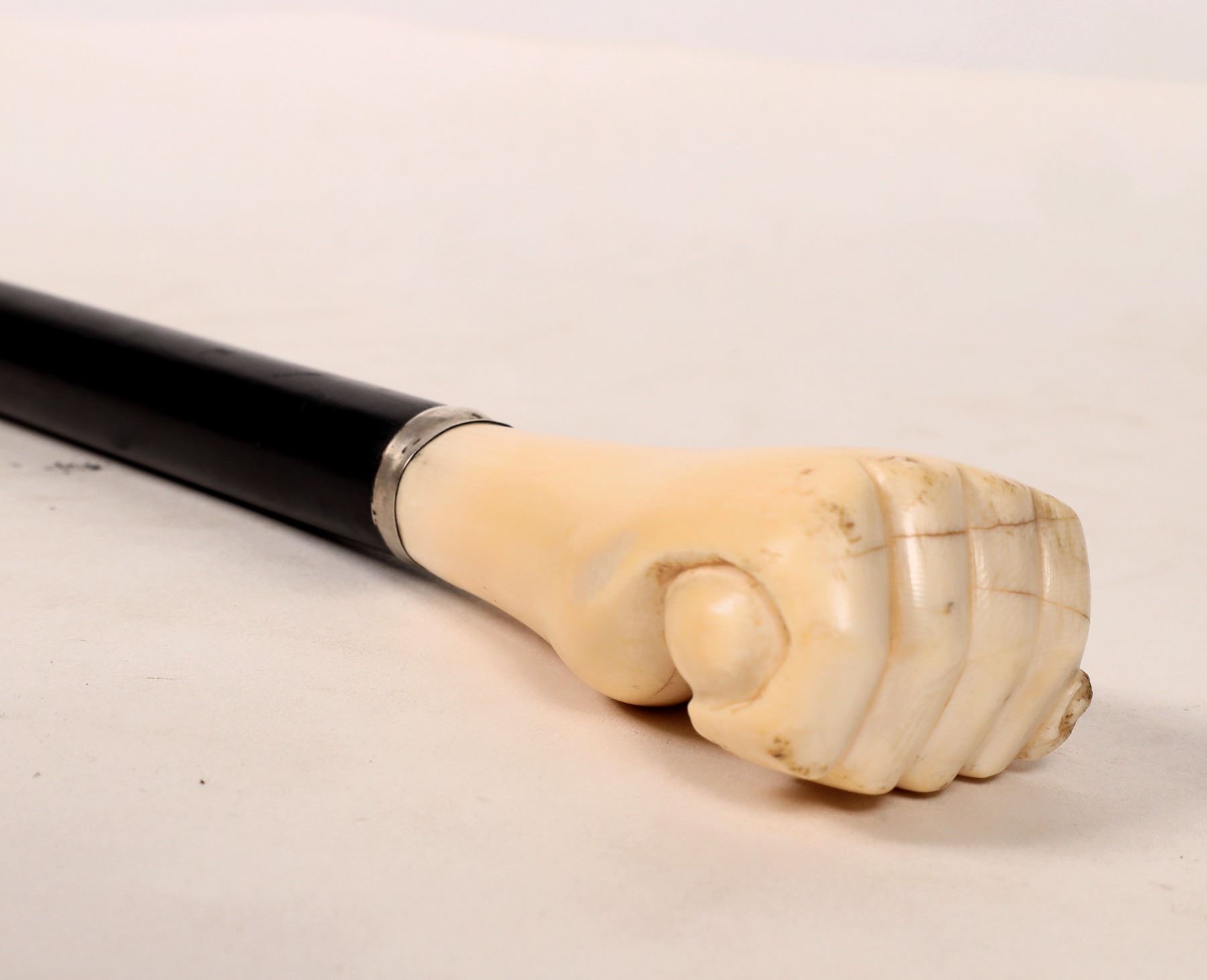 This 33.5" cane has an ivory or bone grip in the shape of a clinched fist, which in some circles, unions or fraternal organizations, signifies solidarity. There's a 1.5" crack in the grip, but other than that, cane is in nice condition. Please see photos for more details