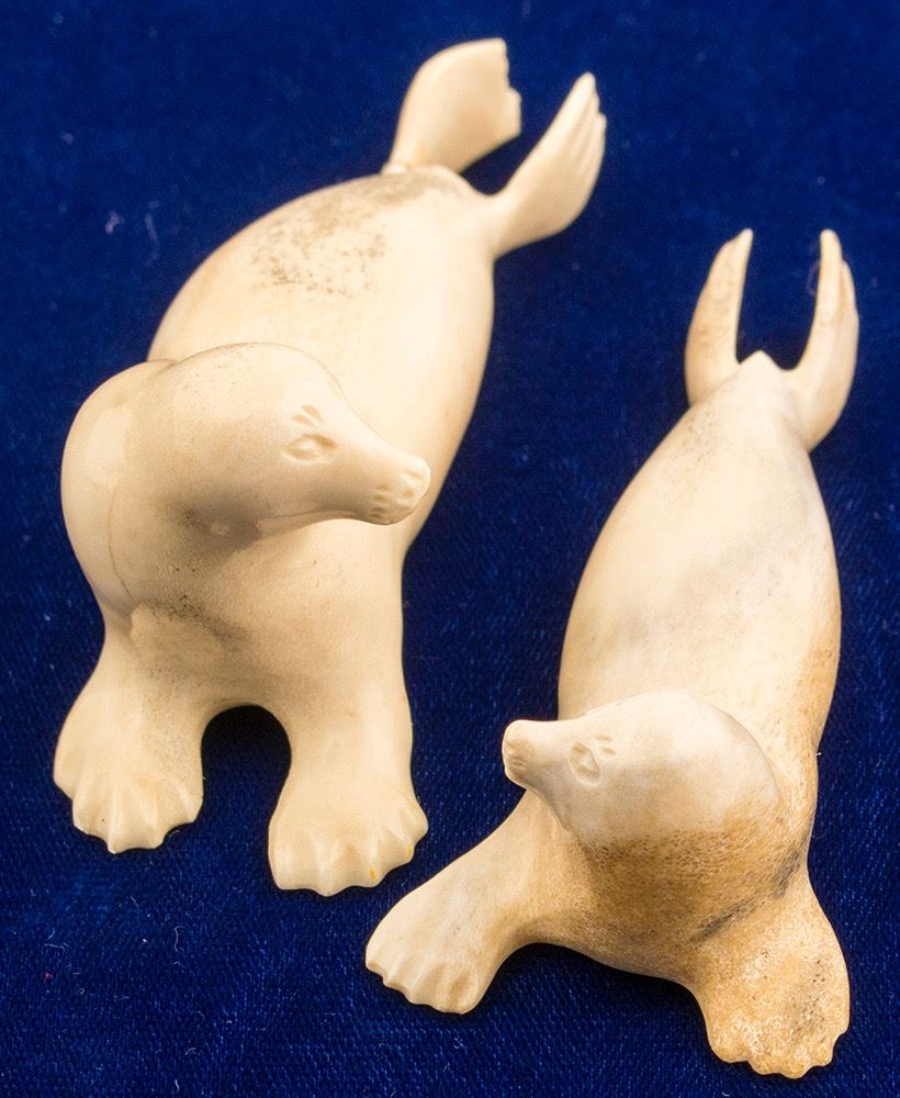 Two seals with fine facial details. Largest seal measures 4". Both are laying down and face each other. Nice set!