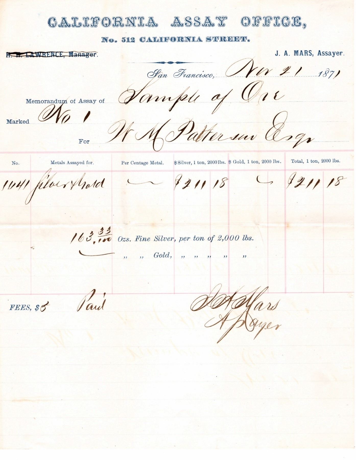 J. A. Mars California Assay Office, 512 California Street, San Francisco Ò November 21, 1871 - No.1042 Memorandum of Assay Ïof Sample of Ore Marked #2Ó for H.M. Patterson Esq. This receipt measures 7.75 x 9.75Ó and is printed on letter sheet buff colored paper in a medium blue ink. Metals Assayed ÏPlacer Gold.Ó at Ï$131.99 Silver, 1 ton, 2000 lbs.Ó Signed J. A. Mars, Assayer. The address of this assay office is the same as George E. Rogers successor to G. W. Bell and must have passed to Lawrence and Mars sometime around 1870. The California Assay Office at 512 California Street was originally managed by H.H. Lawrence, with J.A. Mars as the assayer. Mars bought out Lawrence in mid-1871 and ran the assay office for a while thereafter. Assay reports or bullion receipts from this firm are extremely rare, with a rarity of R8 (1 to 3 pieces known). Very Fine. Very Rare California Assay Office Ore Memorandum, 1871, Possibly for Comstock Silver. This is the rare form for this San Francisco assay office. California Assay Office, No. 512 California Street, J.A. Mars, Assayer (H. H. Lawrence crossed out). Dated Nov. 21, 1871. The address of this assay office is the same as George E. Rogers successor to G. W. Bell and must have passed to Lawrence and Mars sometime around 1870. The California Assay Office at 512 California Street was originally managed by H.H. Lawrence, with J.A. Mars as the assayer. Mars bought out Lawrence in mid-1871 and ran the assay office for a while thereafter. Memorandum of Assay of ÏSample of OreÓ No. 1 deposited by W.H. Patterson, Esq. Assayed for silver and gold, but the sample contained only silver, 163.33 ozs per ton. Signed by J.A. Mars. 9.75 x 7.75Ó Folds. Where was this ore from? W.H. Patterson was a lawyer in the firm Patterson & Stow, 513 Jackson St. according to the 1871 SF directory. W.W. Stow, his partner and brother-in-law, was a very prominent railroad lawyer. According to the Annual Mining Review & Stock Ledger (1876), Patterson was at one time a trustee for the Mariposa Land & Mining Co. and both president and trustee for the Leviathan Mine in Gold Hill, Nevada. The fact that this ore sample is high-grade silver would point to a Nevada source. Therefore, it is possible this assay was for a Comstock Lode sample, perhaps even from the Leviathan. The Leviathan was staked in 1863 on the East Ledge, 1,000 feet in front and parallel to the Comstock Lode, opposite the Belcher and Crown Point Mines. The East Ledge (and this mine) were actively developed in 1874 when the mine was taken over by a San Francisco corporation. Assay reports or bullion receipts from this firm are extremely rare, with a rarity of R8 (1 to 3 pieces known). Very Fine. Size: 7.75 x 10 inches. San Francisco California 1871