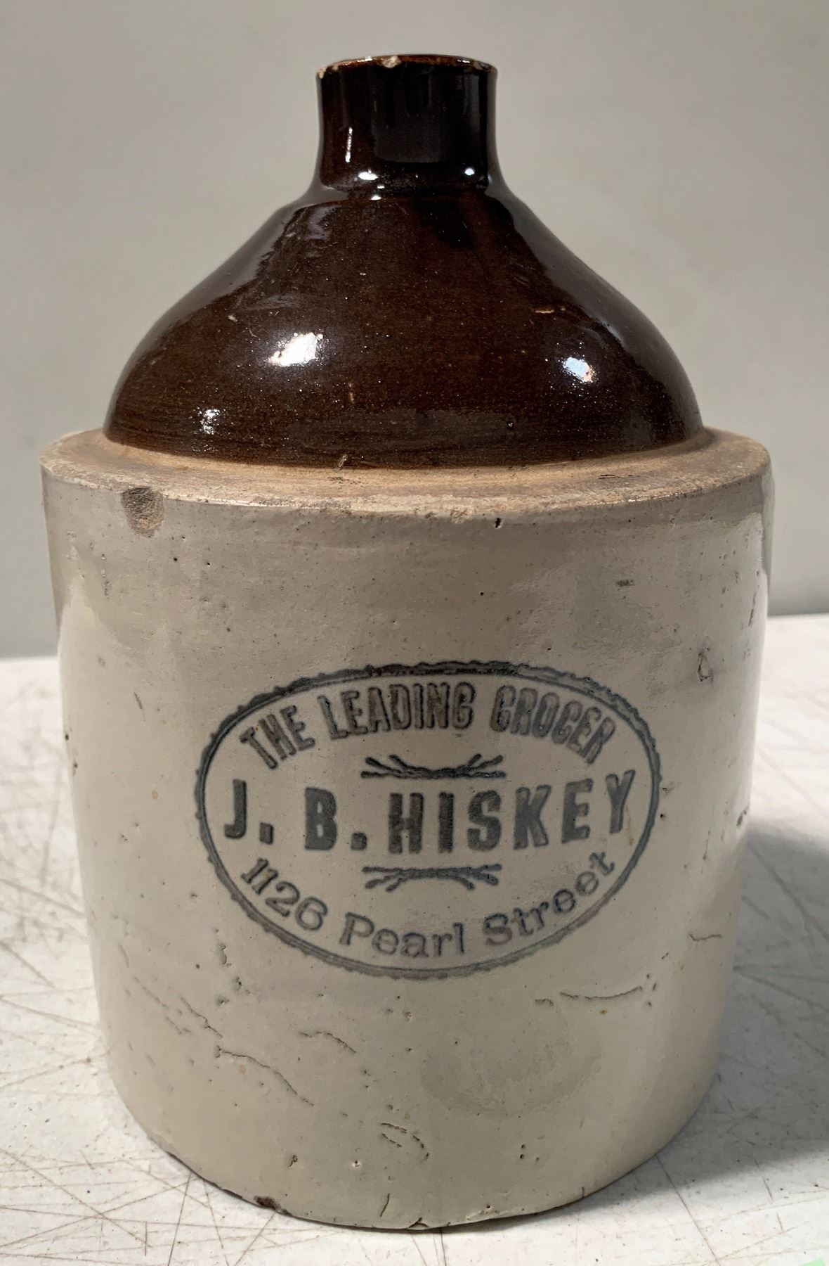 J-9 in Preble. Small edge chip. Brown top. 5.5" diam., 8.5" tall. Half gallon.