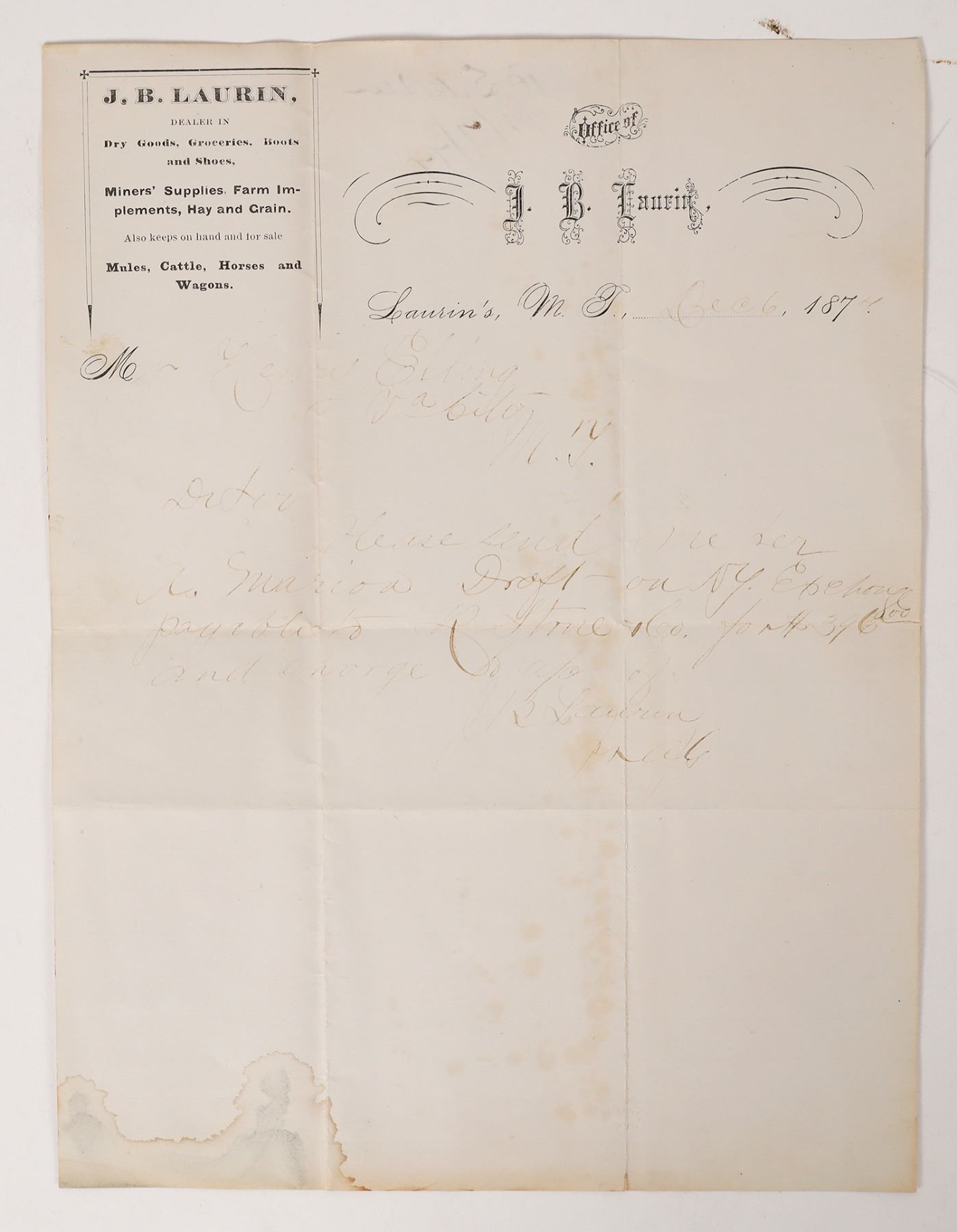 J.B. Laurin a French Canadian trader and merchant, signed letterhead. Laurin was based in southwestern Montana and nurtured a relationship with the local Indian tribes. Please see photos for more details. Montana 1877