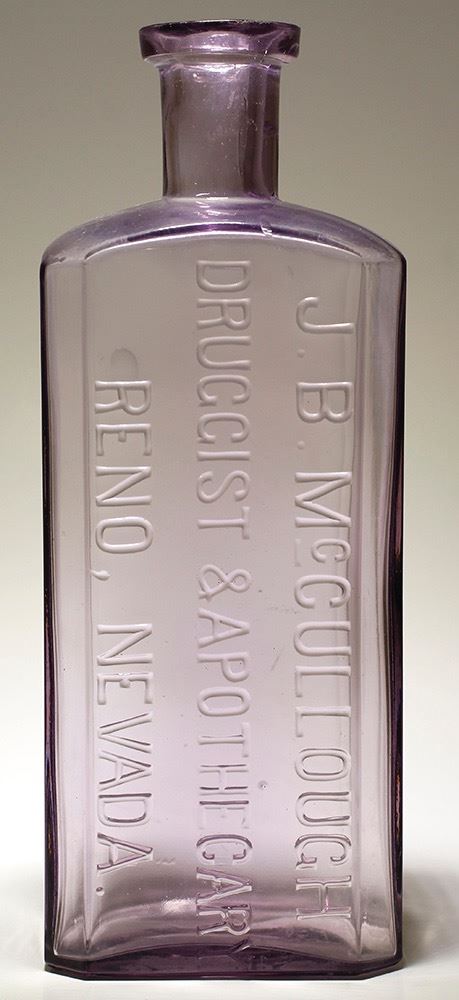 J. B. Mc Cullough / Druggist & Apothecary / Reno , Nevada // Flat Base with acorn..Variety 3, 1891-1900. Bold embossing, super mint, Tolled top, minor in making roughness on neck , never smoothed out...not damage. A great looking bottle! Date: Location: Reno, Nevada HWAC# 59201 PLEASE ASK CONDITION QUESTIONS BEFORE BIDDING. ALL BOTTLE SALES FINAL.