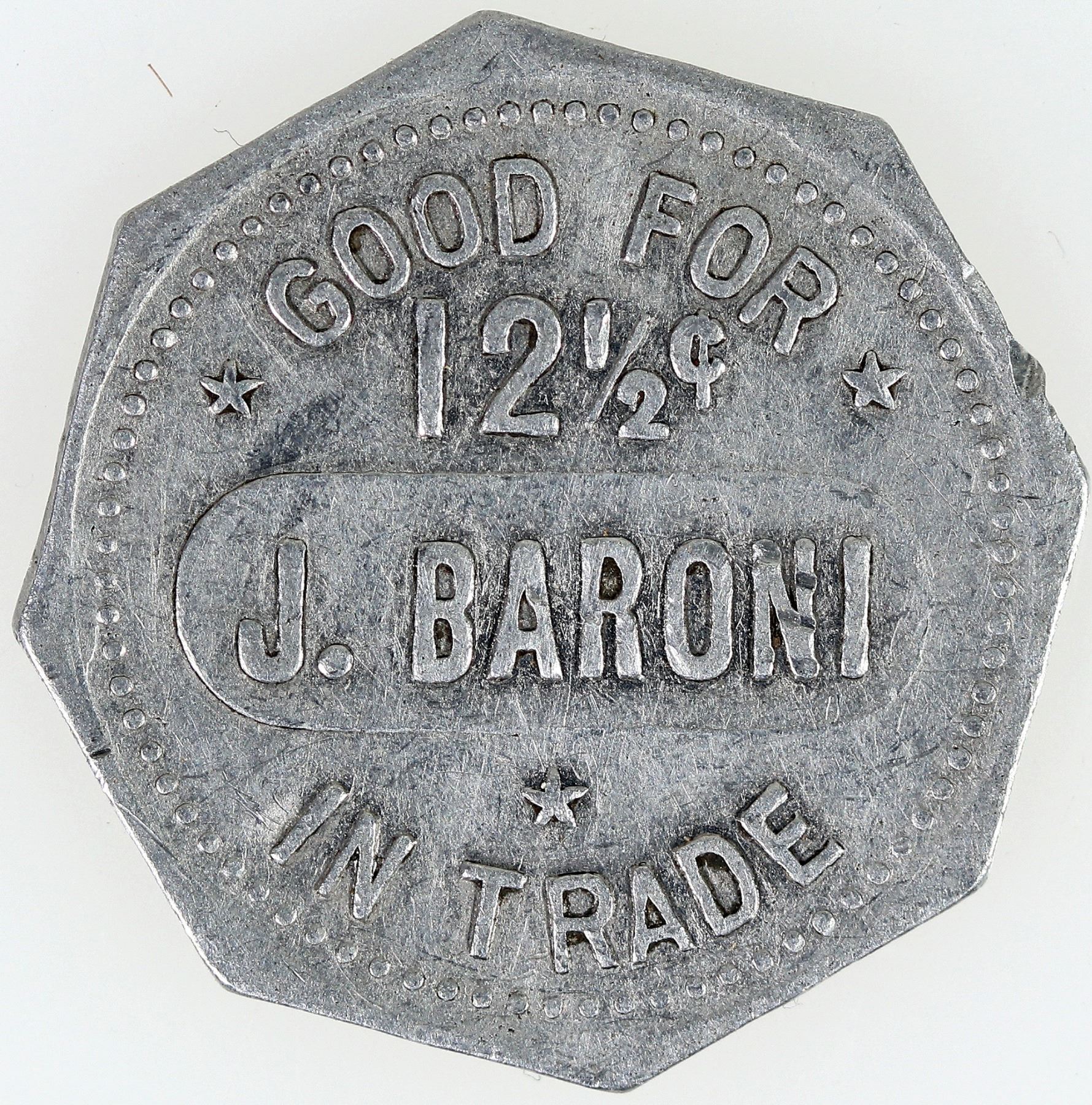 We purchased this token years ago, reported as Marble, Colorado. At present, it is highly unlikely. J. Baroni appears in newspapers.com in Eureka, Nevada in 1905, and in San Francisco circa 1907-8, which we assume is the same person. he belonged to the Italian American society, but we cannot find him anywhere advertising his saloon or pool hall, or in any directory 1888-1909, nor in any census records. The opinion is thus that this was for a short-lived saloon, circa 1905-1908, or a bit earlier, as his name was important enough to publicize on a personal level, but his business was never mentioned in the newspapers.