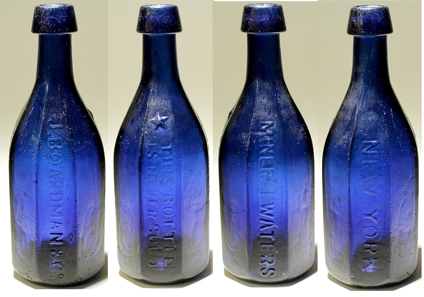 J. Boardman & Co / New York / Mineral Waters / ( embossed Star) This bottle/ is never sold // ( 1850's). Medium to deep cobalt blue. Dug, and cleaned to near mint condition. Retains overall light wear and etching. No chips or cracks.Nice item... Date: Location: New York HWAC# 57705