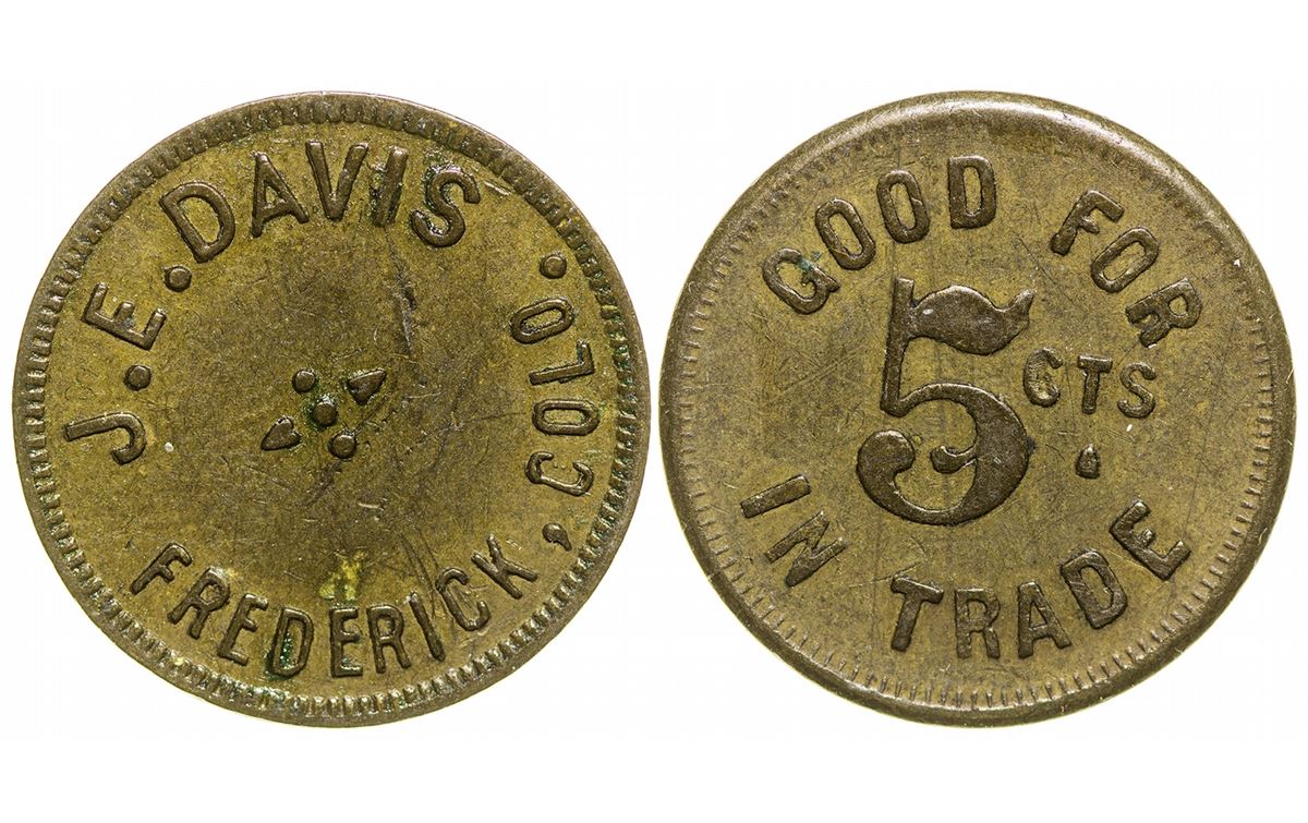 J. E. Davis / Frederick, Colo. // GF / 5c / IT. Only seven known and from small town saloon.