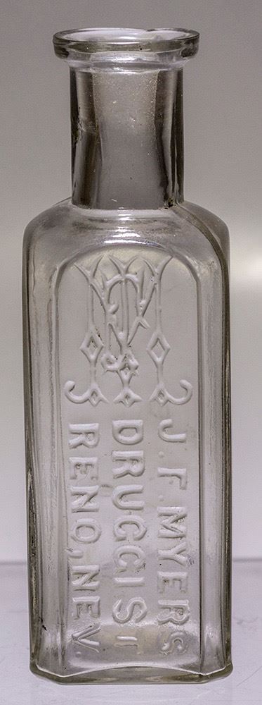 Approx 3.5" high. Extra rare Nevada medicine. See Nevada Bottle Book Volume II p221-224 for complete history on this bottle and the drug store merchant John F. Myers who died of a morphine overdose after the sale of his drug store in 1885. Same example shown in book. Date: c1879-1884 Location: Reno, Nevada HWAC# 571637