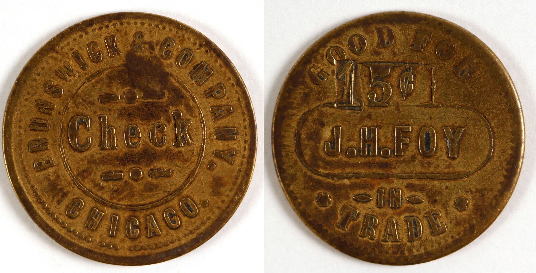 Obv.: Good For 15c / J.H. Foy / In / Trade; Rev.: Brunswick Company / Check / Chicago. Territorial piece, EV-9. Br., rd., 24 mm. There are no tokens listed from Ashley in the Montana Token Book. J.H. Foy is listed in Ashley in 1888-1889 and 1890 R.G. Duns as a Saloon Proprietor. State: Montana City: Ashley & Demersville Date: ID# 79401