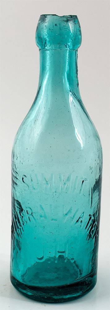 Summit mineral water; J. H. (Jacob Hoen) ran the Summit Mineral Water business out of Sacramento from 1871-1882. Hoen's marketing gimmick was mineral water from springs near the top of Donner Pass. He brought the water down for bottling in Sacramento in a wagon. This bottle is a choice example, and a very showy specimen. Please see Holabird, "Nevada Bottle Book, Volume I", page 129. City: Sacramento State: California, Date: Inventory# 40916