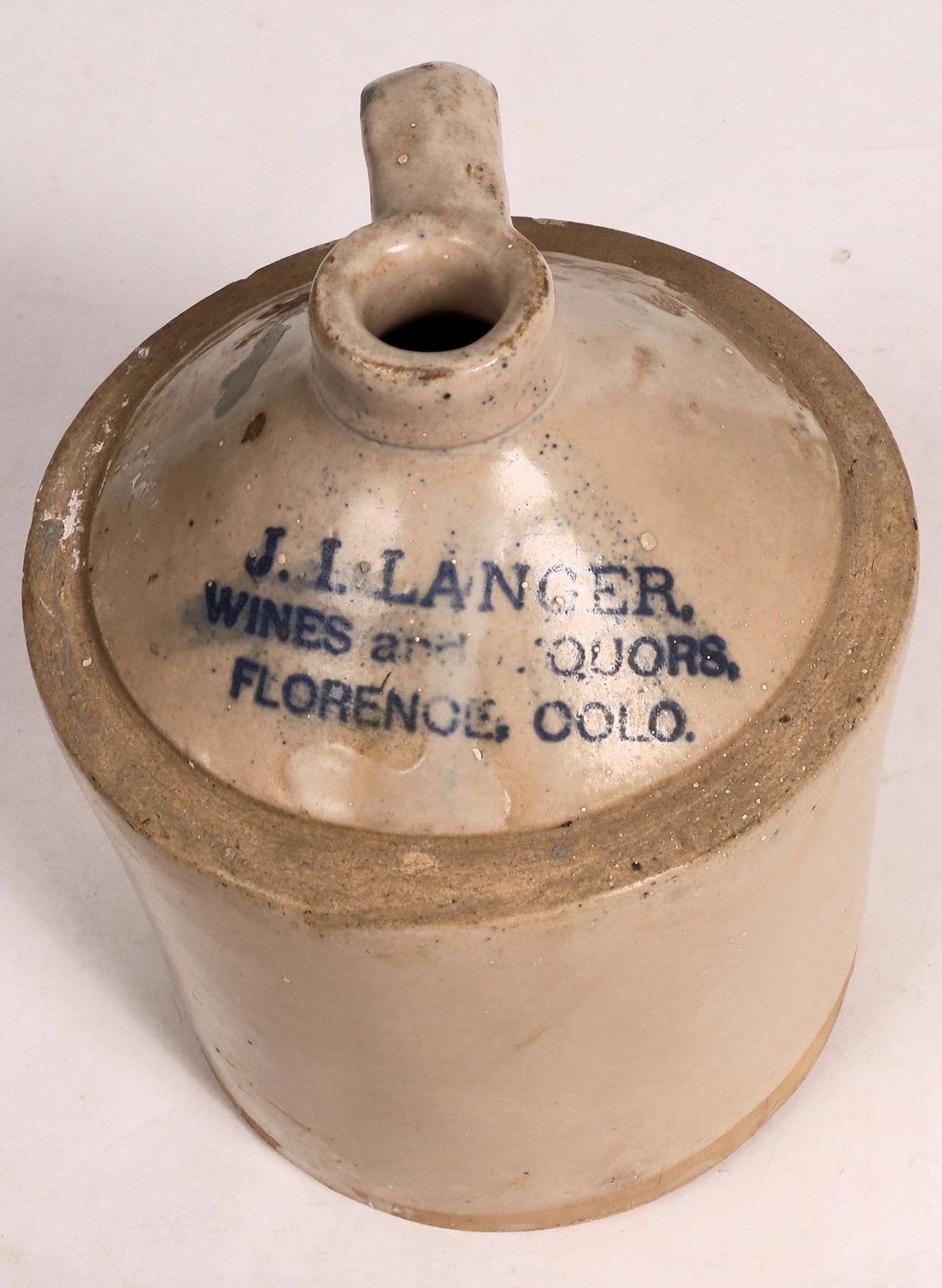 J146 in Preble. J. I. Langer,/Wines and Liquors,/Florence, Colo. 8x5.75". Blue and gray glaze residue on handle and shoulder, possible base repair, base chips, no apparent cracks.