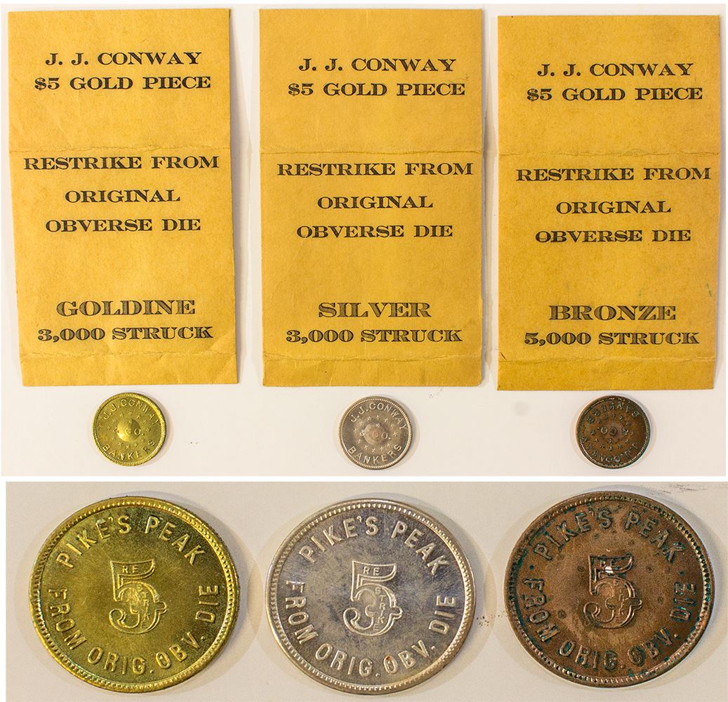Lot of three restrikes from the original obverse die of the rarest of territorial gold pieces. The pieces are struck in bronze (5,000 struck), goldine (3,000 struck), and silver (3,000 struck). Obv.: J.J. Conway / & Co. / Bankers; Rev.: Pike's Peak / 5 / From Orig. obv. die. With the original packaging.