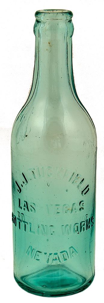 J. J. Tuckfield, Las Vegas Bottling Works Nevada. Four piece mold Crowntop soda bottle. Sparkling clean, bright and vibrant. The Tuckfield soda is one of only two embossed bottles from Las Vegas from the early period, c1905-1910. Both are exceptionally rare. There are only two specimens of the Tuckfield bottle known, though there is a report of a third specimen. Of the two known, both have a crude "W" etched in the shoulder which probably was the initial successor of Tuckfield. Tuckfield started his soda works in 1907 in Las Vegas. It lasted until at least 1915. By then the majority of Tuckfield's business was beer, so he probably didn't last long as the prohibition approached. Of the two specimens known, one has been known for decades. The second example surfaced recently in an eBay sale. We had heard about that bottle for more than 25 years, and had wondered what it would finally come out of the woodwork.. See Holabird, Vol. l, pp 141-142. City: Las Vegas State: Nevada Inventory Number: 38178