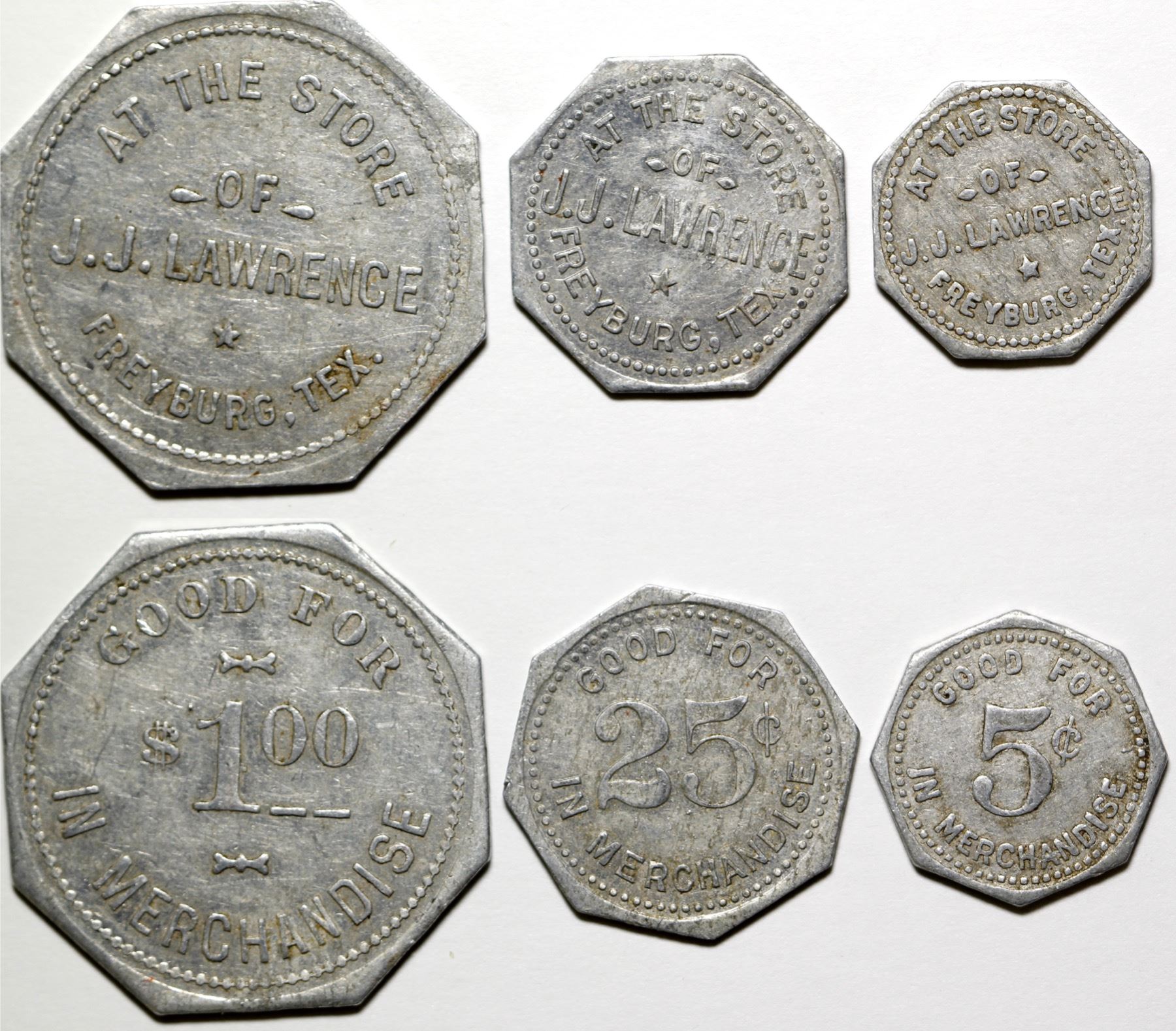 Three pieces. GF 5c, 25c, and $1.00 at the store of J. J. lawrence State: Texas City: Freyburg Date: HWAC# 85352