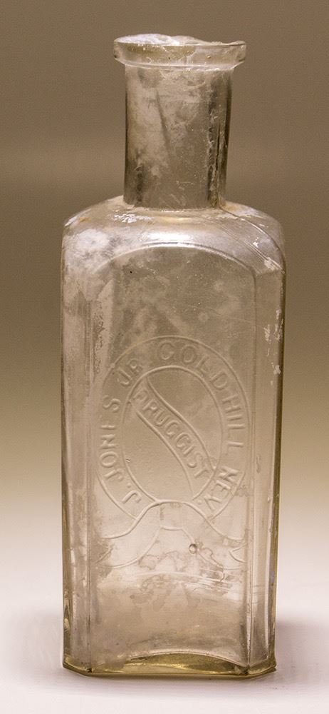John Jones Jr. embossed in a ribbon pattern in flint glass. internal stain as originally found. lip chips. Jones was a pioneer druggist on the Comstock, coming in 1864, right after Morrill and Cole. This bottle is thought to be his first drug bottle. Made in flint glass and shows the drip under the lip where the top was hand applied and flattened. During the research for the Bottle Book, this was the only example of this bottle located. This is the example shown in "Ghost Towns & Medicines, Nevada Bottle Book Volume II", p162. City: Gold Hill State: Nevada, Date: Inventory# 40929
