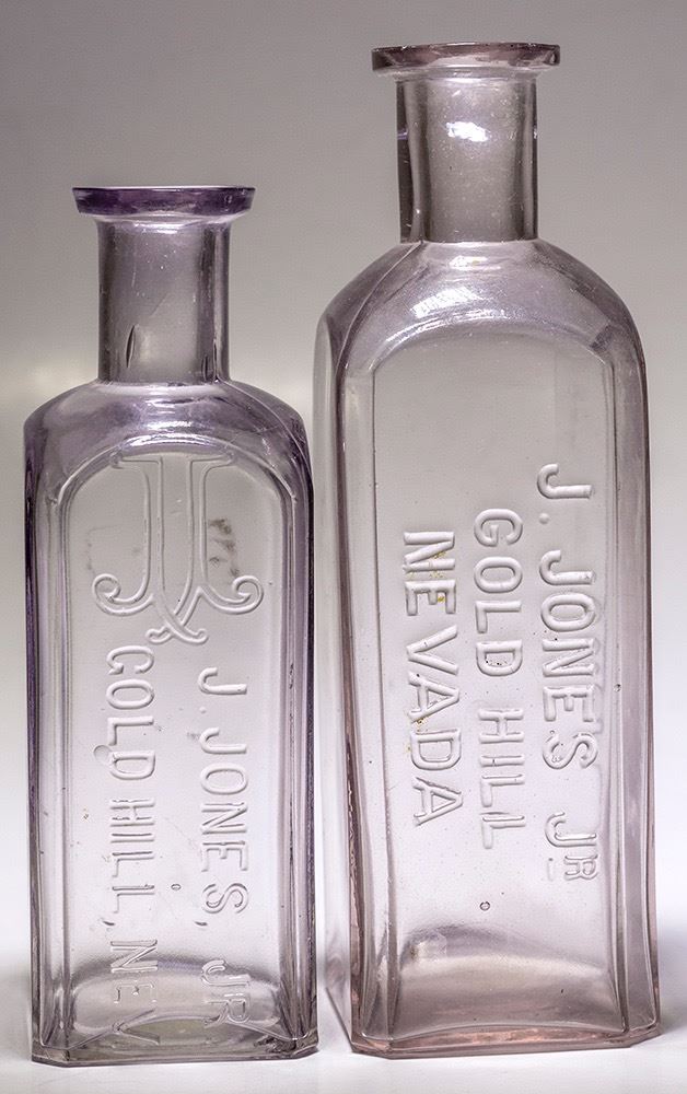 2 clear rectangulars. 5" J. JONES, JR. / GOLD HILL, NEV. 5.75" J. JONES JR / GOLD HILL / NEVADA. No visible chips or cracks. Holabird page 163 book examples. Date: Location: Gold Hill, Nevada HWAC# 57938