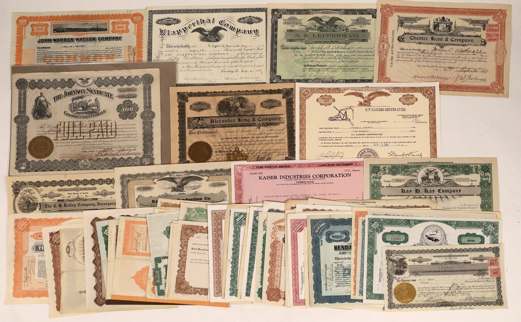 About 2/3 of the certificates are issued, the rest are unissued. Nice selection of stocks with names beginning in J,K, or L. Some good ones include The Johnson Syndicate Limited Construction Company (KS), issued in 1894. Large size certificate has a factory scene vignette. There is also a Klapperthal Company stock, issued at Reading, PA. in 1889 and a N.S. Lepperr Company stock issued at Chicago in 1895. Also, A John Warren Watson Co. stock inc. in Philadelphia, issued in 1946. The company manufactured car stabilizers for the suspension. An interesting and varied group of stock certificates in average condition.